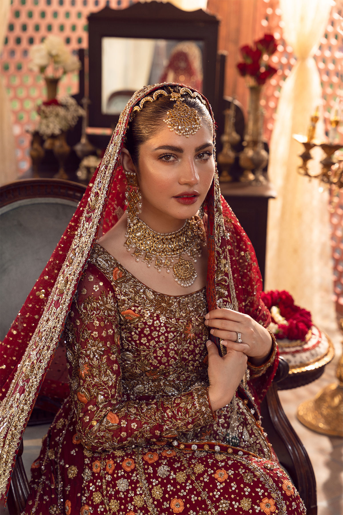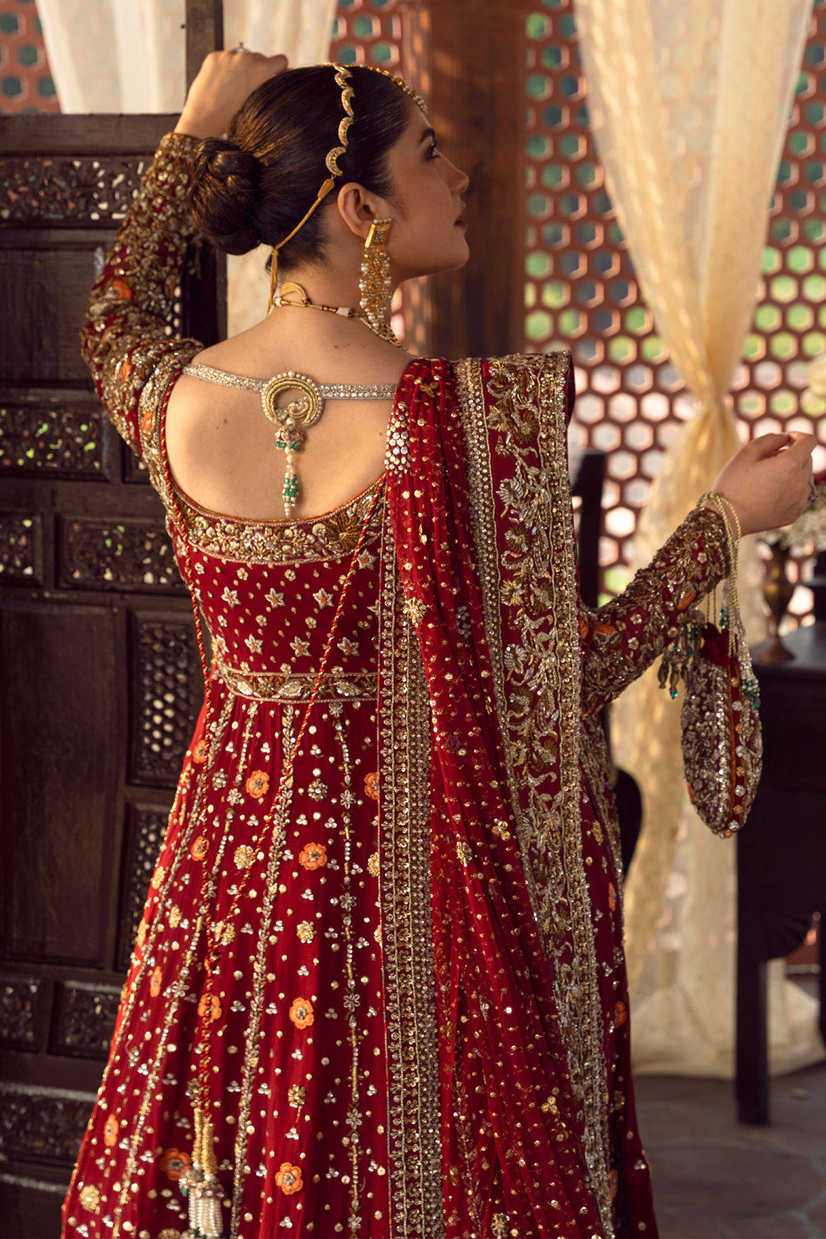 A magnificent and traditional bridal ensemble featuring a heavily hand-embellished long Peshwas/Anarkali in rich ruby red, paired with a shimmering patterned skirt, embodying classic elegance.