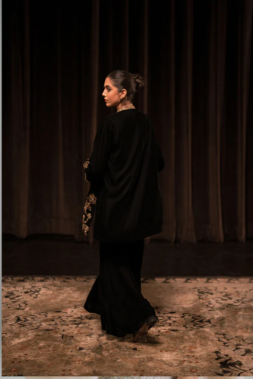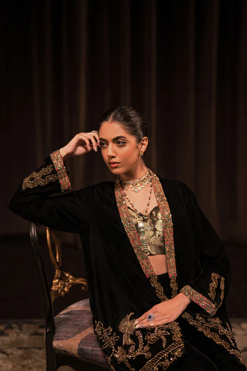 The jackett is designed in an elongated coat-style silhouette crafted from plush black velvet, exuding power and sophistication. The front opening, neckline, and hem are richly adorned with ornate handcrafted embellishments that create a dramatic contrast against the deep black base. Fine beaded accents are delicately scattered across the surface, while dense detailing along the hem adds depth and refinement. The sleeves are fully embellished, enhancing the opulent and commanding character of the ensemble. A smooth inner lining ensures comfort while maintaining a structured, graceful fall.