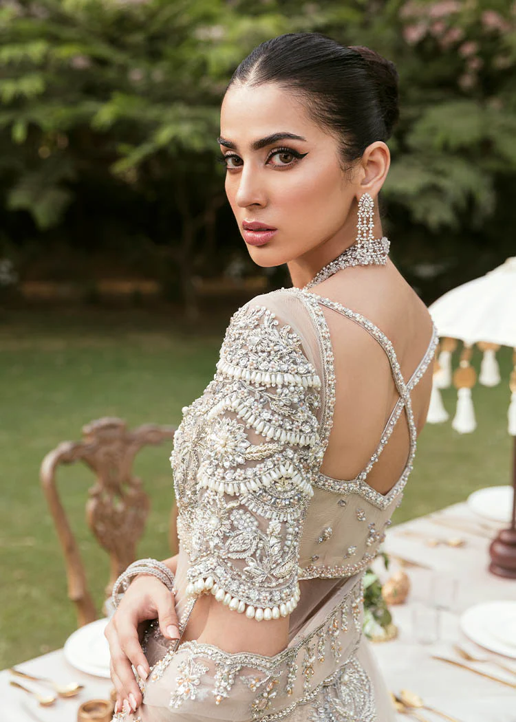 The peshwas is styled as a nude side-slit gown in net, decorated with floating floral clusters made from pearls and crystals. The elbow-length sleeves feature bold scalloped detailing that adds a chic, modern edge for today’s bride. The silhouette is elegant yet contemporary, with a comfortable lining to keep the gown easy to wear.