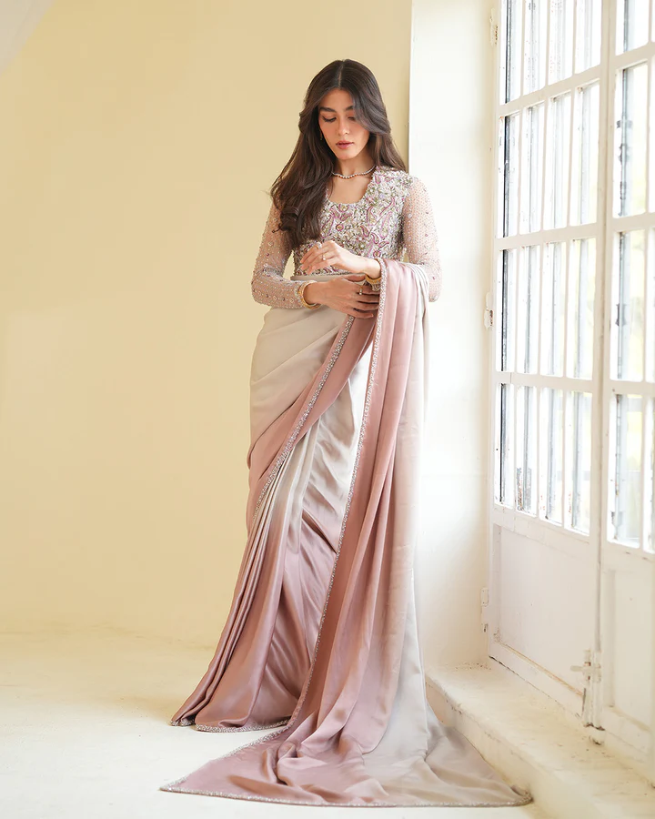 The saree is crafted with embellishment that complements the detailed blouse. Its soft drape flows beautifully, enhancing the ombré aesthetic with a refined sheen. The subtle adornments distributed across the saree create a cohesive and elegant look suitable for festive, formal, and evening wear.