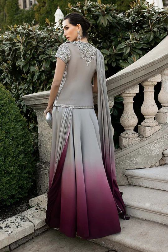 A flared ombre shamoze silk skirt in soft grey and burgundy hues that gracefully complements the embellished blouse, creating a dreamy, regal silhouette ideal for special occasions.
