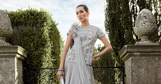 A mesmerizing hand-embellished organza blouse detailed with mukaish, piple gira, beads, crystals, and dabka-naqshi work that forms dramatic floral and foliage motifs. The delicate craftsmanship reflects a perfect balance of classic artistry and modern sophistication.