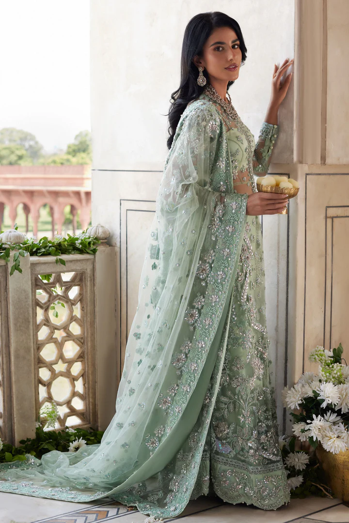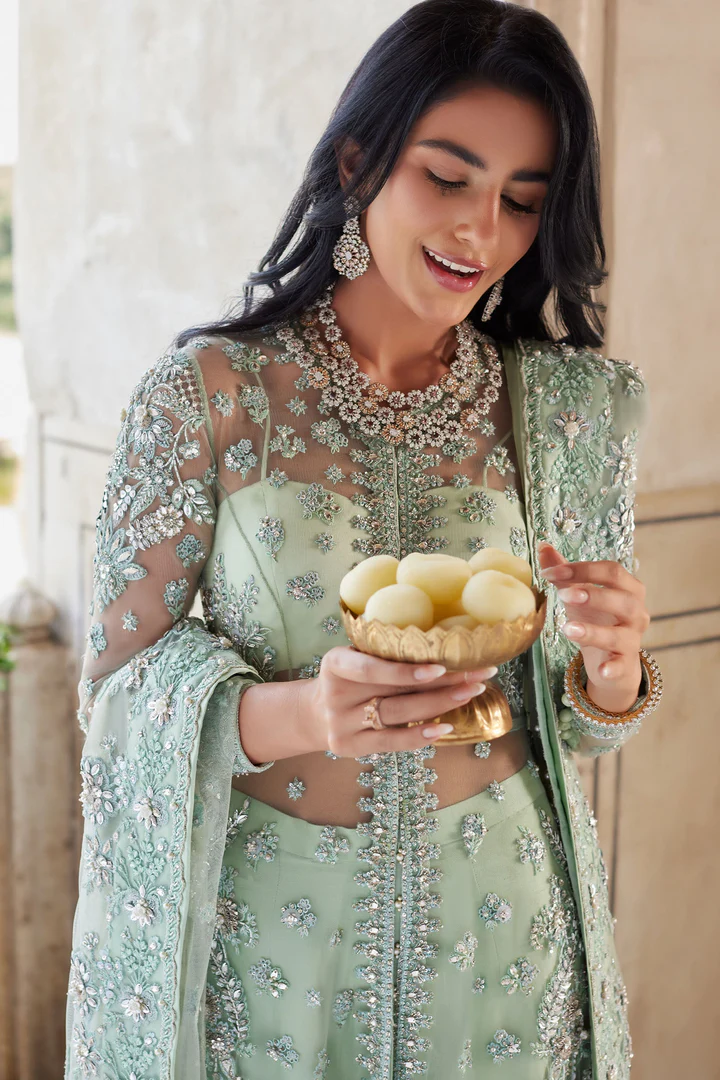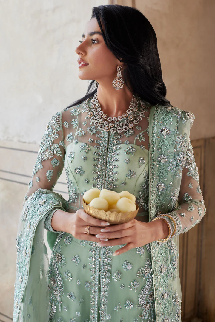 The Pakistani gown is designed in an elegant open-style silhouette and rendered in an alluring blue shade that radiates sophistication and charm. Crafted with meticulous attention to detail, the gown is beautifully hand-embellished with shimmering crystals, delicate silver ornaments, lustrous pearls, and fine embroidery. These glamorous elements are artfully arranged across the surface, enhancing the richness of the fabric while creating a striking visual contrast. The open-front design adds a contemporary edge to the traditional gown, making it a perfectly trendy yet timeless choice for wedding celebrations and formal occasions.