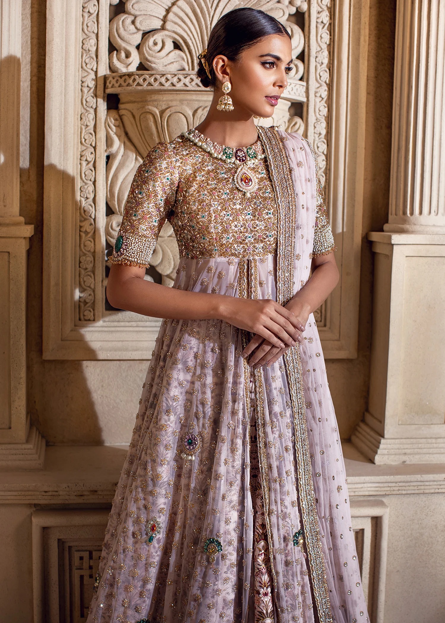 The top is designed as an elongated, front-open peshwas silhouette cut from premium lilac net and katan silk. The bodice and half-length sleeves are densely encrusted with ornate golden appliqué and floral embroidery, creating a shimmering, regal texture. Its front opening and neckline are highlighted with meticulous beadwork and stone accents that contrast beautifully against the soft lilac base. Fine crystals and sequins are scattered throughout the translucent panels of the skirt, while the hem carries a heavy, decorative border for added refinement and weight. A soft satin lining ensures a structured fit and seamless comfort.