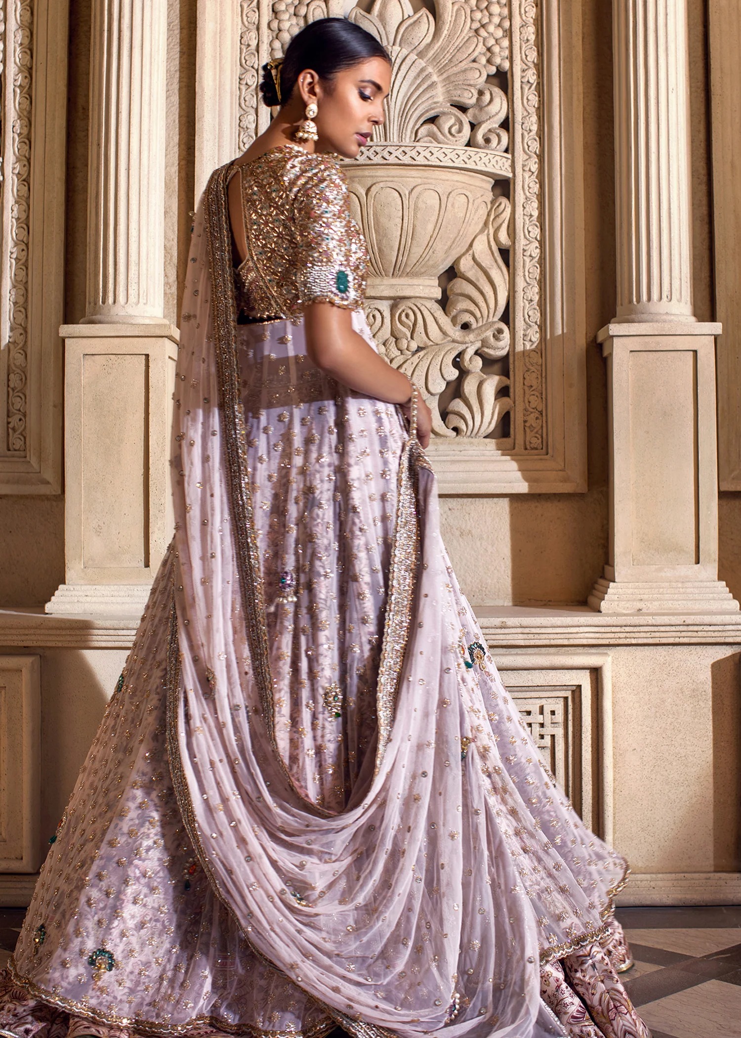 The dupatta is made from sheer lilac organza, bordered with detailed gold embellishment and shimmering appliqué that complements the intricate work of the peshwas. A delicate spray of sequins and small hand-worked motifs add a soft radiance throughout the fabric. The edges are meticulously finished with a metallic trim, lending enough structure to maintain a graceful drape whether worn over the head or pinned to the shoulder.