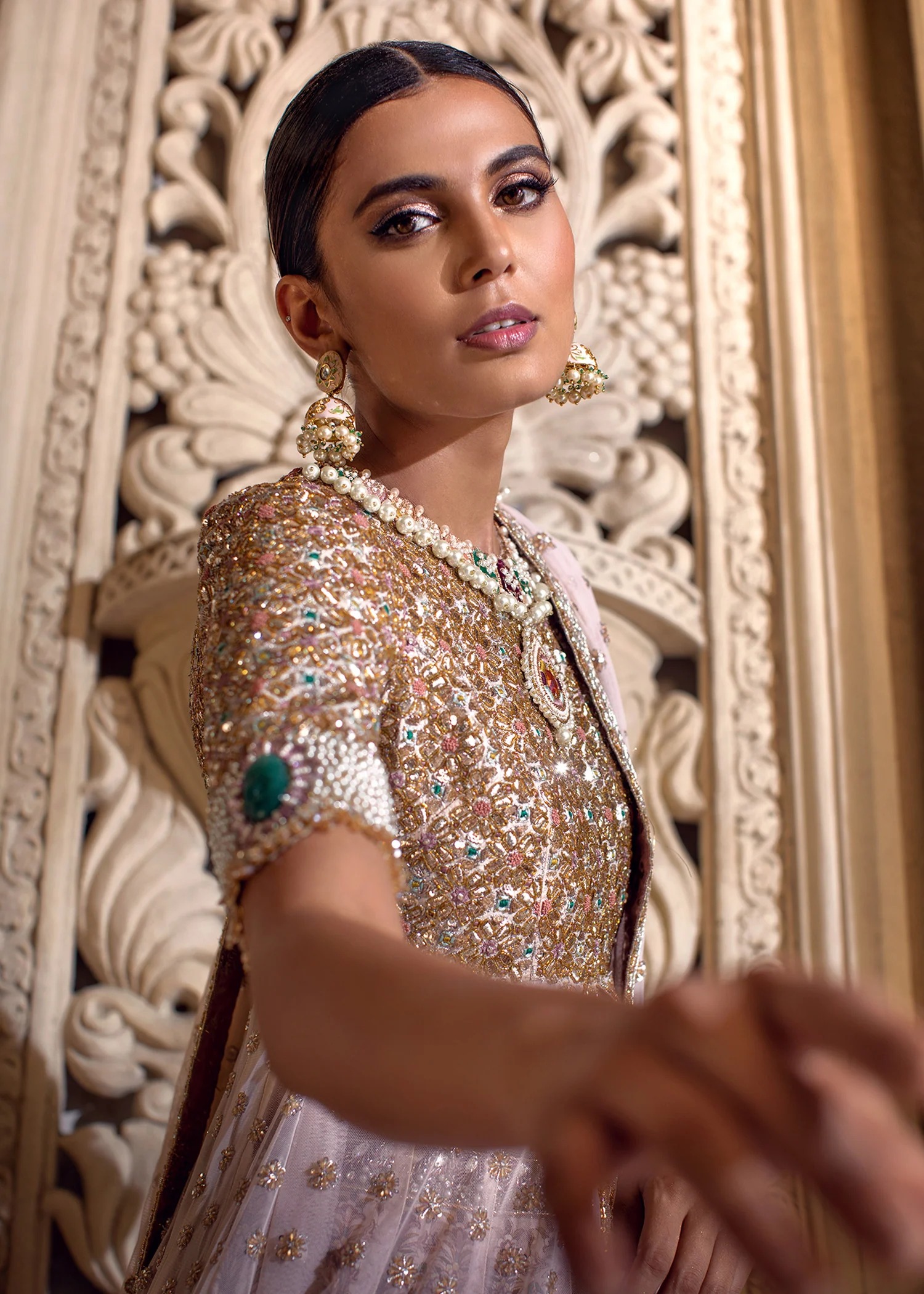 Completely handcrafted using a luxurious mix of sequins, beads, Swarovski crystals, kora, naqshi, and tilla embroidery. The artisanal nature of the hand-embellishment ensures that each piece is a unique work of art, with slight variations affirming its authentic craftsmanship.