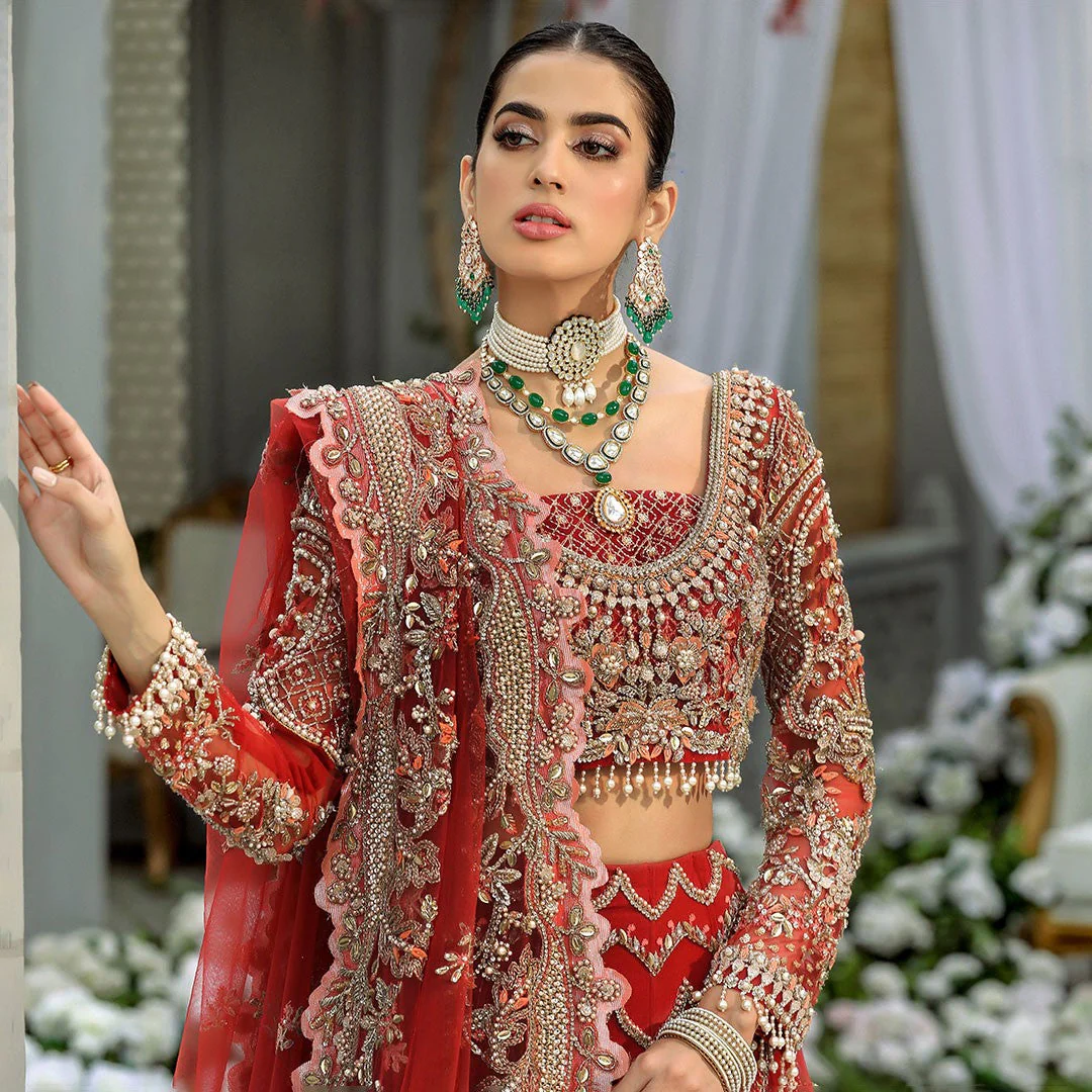 A bold and elegant Pakistani bridal choli lehenga in rich red tones, exquisitely handcrafted with tilla, dabka, zardozi, kundan, and stone work—perfect for a glamorous reception look.
