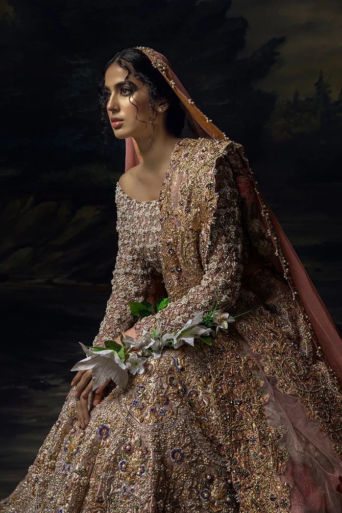 A breathtaking Pakistani bridal lehenga in luminous rose gold tissue, exquisitely handcrafted with intricate embellishments, paired with a delicately adorned net choli and an elegant veil-style dupatta.
