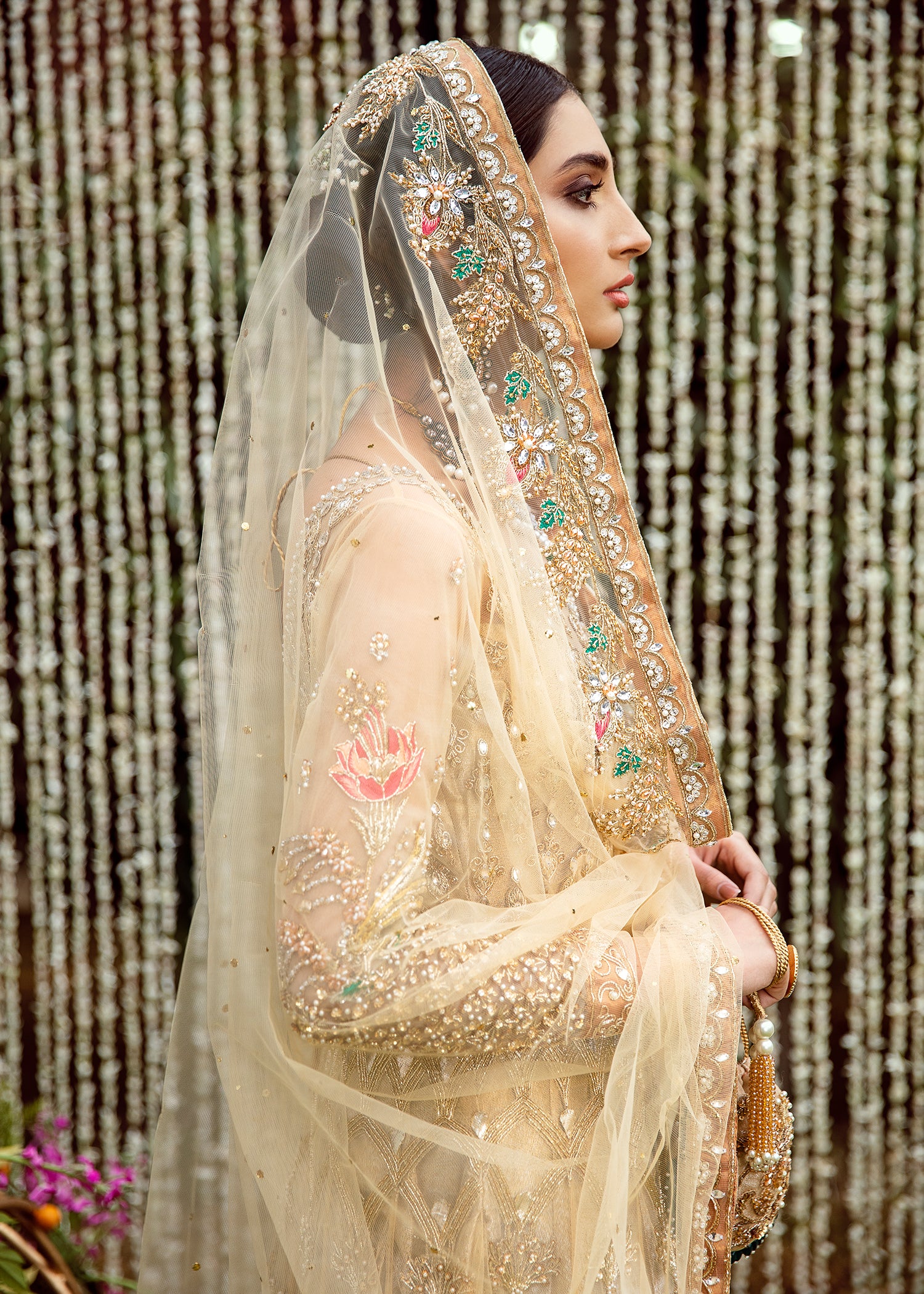 Adorned with peach resham flowers, kundan, zardozi, gota, and fine hand embroidery on premium net and banarsi.
