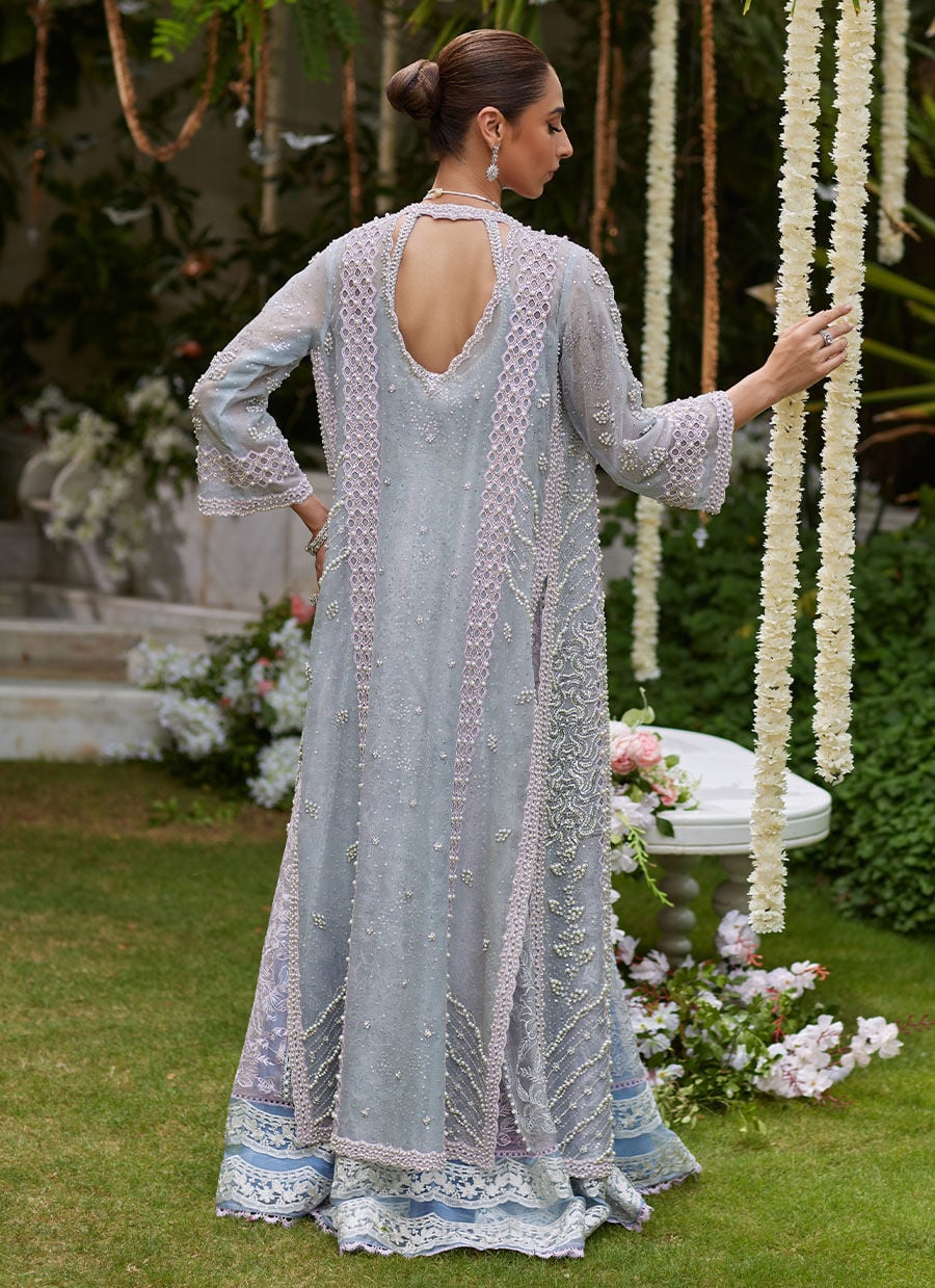 The front-open jacket is crafted from fine net in a luminous pastel shade, designed to create a graceful and elongated silhouette. Intricate silk thread embroidery flows across the panels, enhanced with hand-worked detailing that adds texture and dimension. Subtle pearl accents and delicate floral highlights elevate the design, giving the jacket a refined yet eye-catching finish.