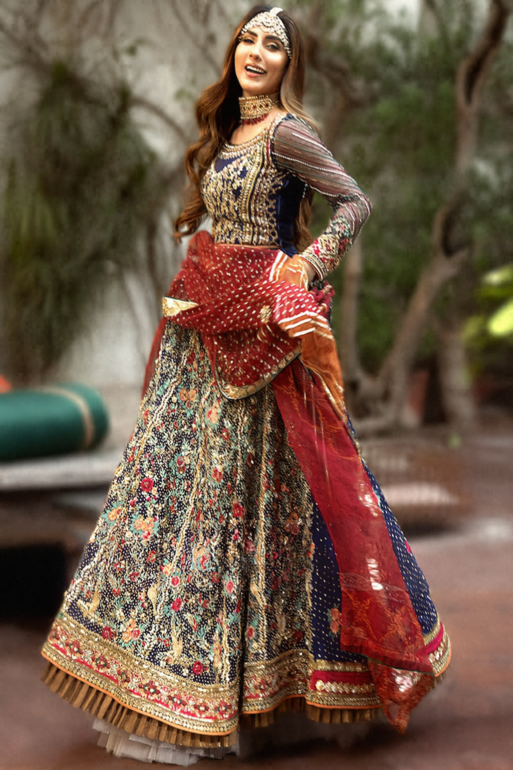 The deep red dupatta adds the perfect contrasting richness, embroidered with delicate motifs and finished with gold borders. The soft drape and lightweight fabric complement the pastel tones while adding depth and tradition to the bridal look.