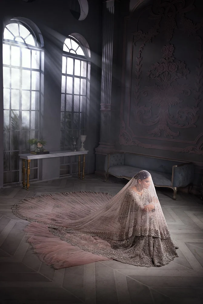 A refined pastel couture ensemble, beautifully handcrafted with silver thread embroidery, cut dana crystals, and pearls, enhanced by elegant long veils and flowing trails for a truly majestic presence.