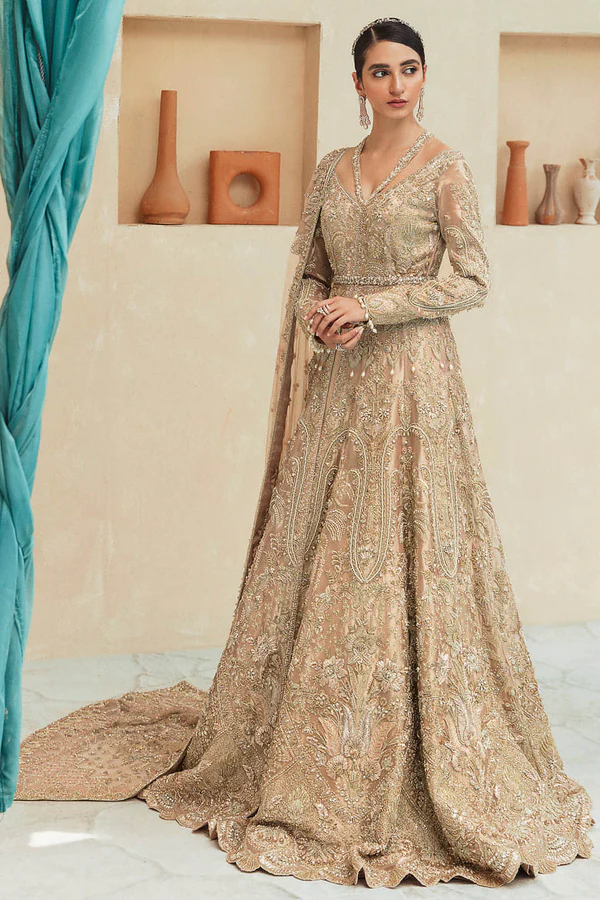 This mandatory couture masterpiece is crafted as an open-style tissue gown bathed in luminous peachy-gold tones. The silhouette is brought to life with dazzling handcrafted details of makesh, gotta, and fine threadwork, lavishly enriched with pearls and cut dana embellishments. Each motif reflects the exceptional skill of our artisans, creating a radiant surface that captures light with every movement while exuding old-world opulence blended with modern bridal elegance.