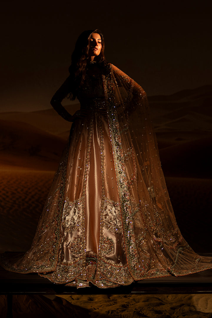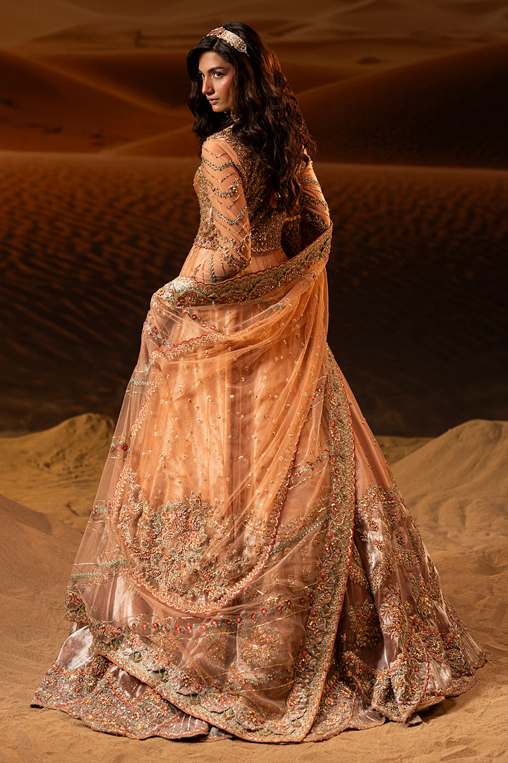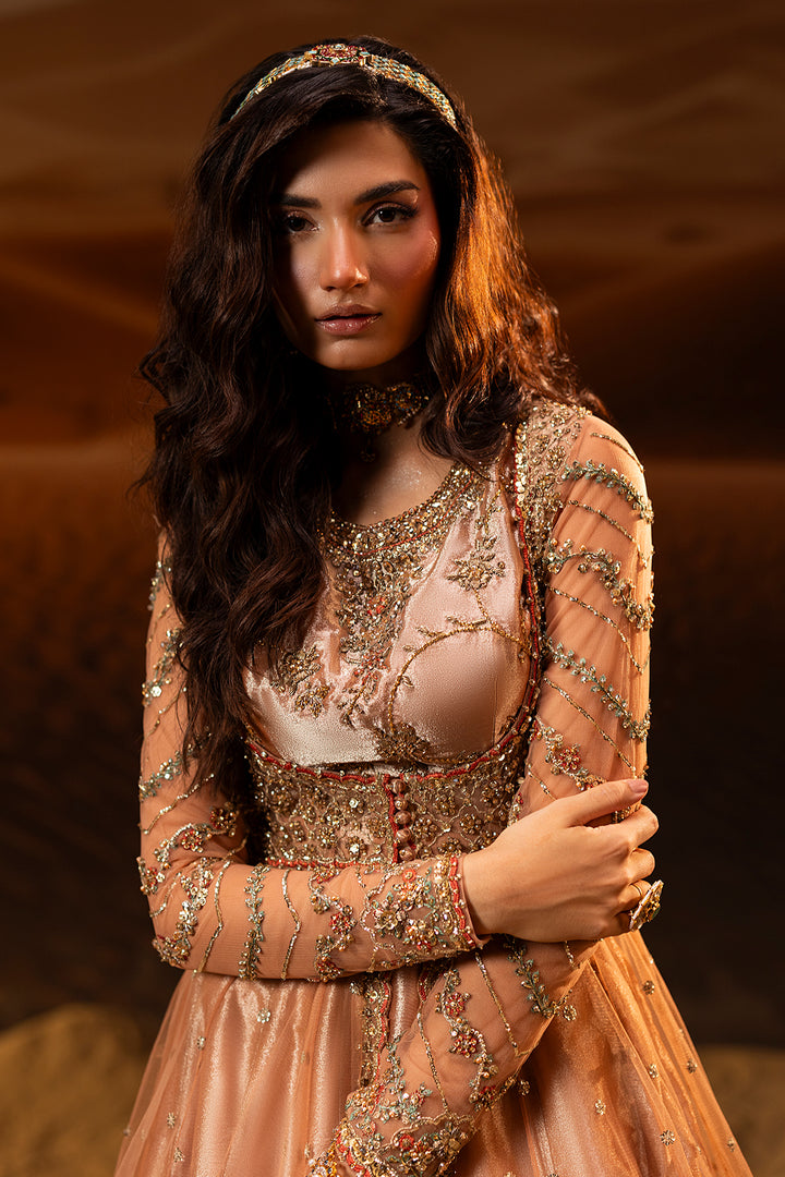 A graceful peach blush pishwas paired with a flowing lehenga, adorned with intricate zardozi and Swarovski embellishments. Finished with soft tissue borders, this ensemble blends timeless tradition with refined modern elegance.