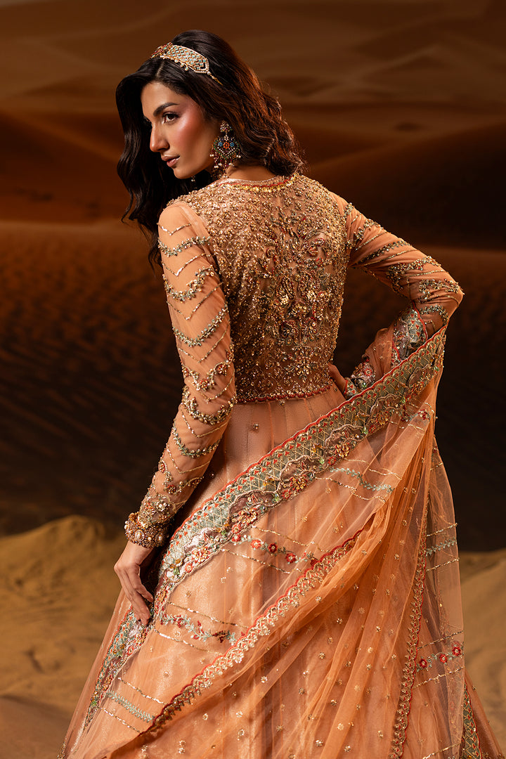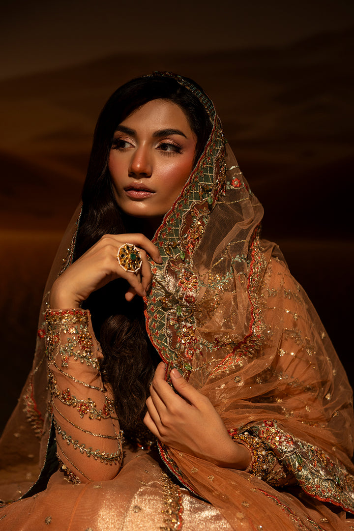 The dupatta is designed in a coordinating soft peach tone, elegantly finished with tissue borders that echo the detailing of the pishwas. Fine embellishments, including sequins and crystal accents, are delicately scattered to add gentle radiance without overpowering the ensemble. Its lightweight drape completes the look with effortless sophistication.