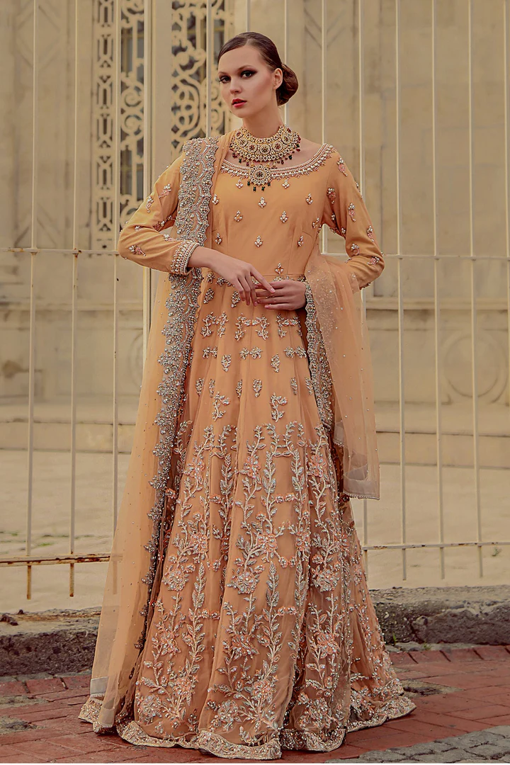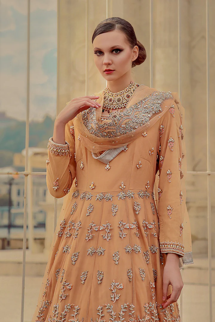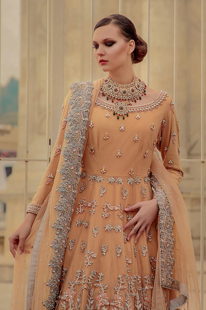 This breathtaking Pakistani Bridal Gown is crafted in a soft peach shade that exudes grace and sophistication. Made from premium net fabric, the gown is lavishly decorated with hand-applied motifs, pearls, beads, and intricate silverwork. Its hemline and borders feature exquisite zardosi details that enhance the outfit’s regal aesthetic. From the neckline to the lower panels, every inch of the gown showcases meticulous artistry, giving it a refined and luxurious finish. The flowing silhouette and impeccable embellishments make this gown an extraordinary choice for brides who seek elegance wrapped in tradition.