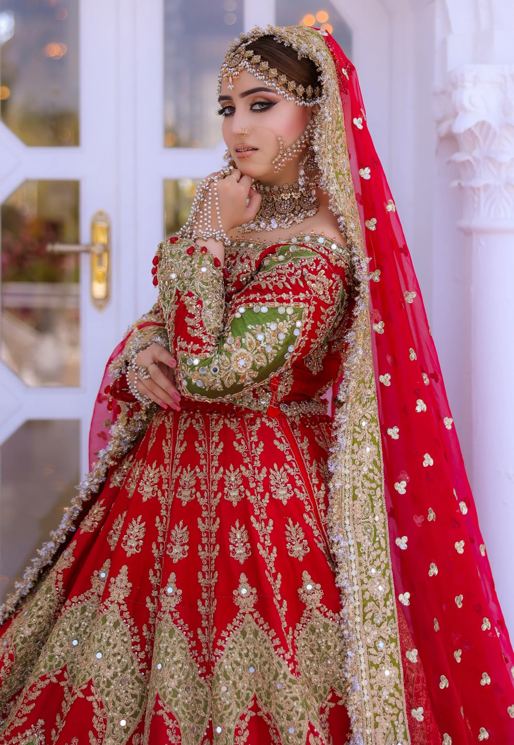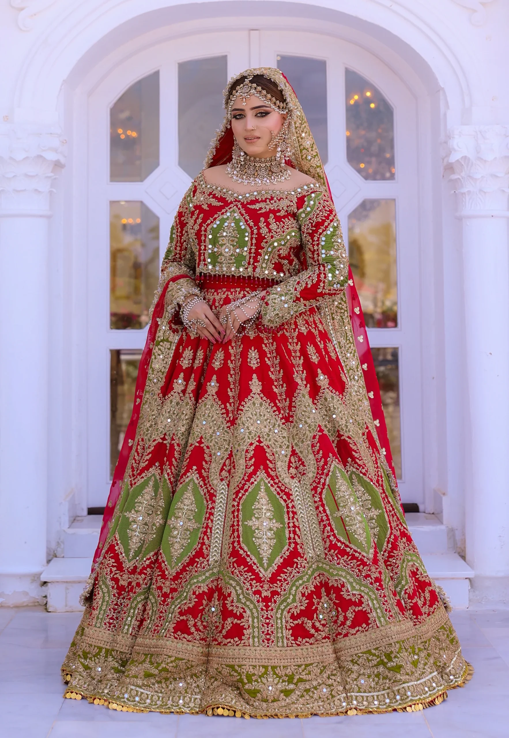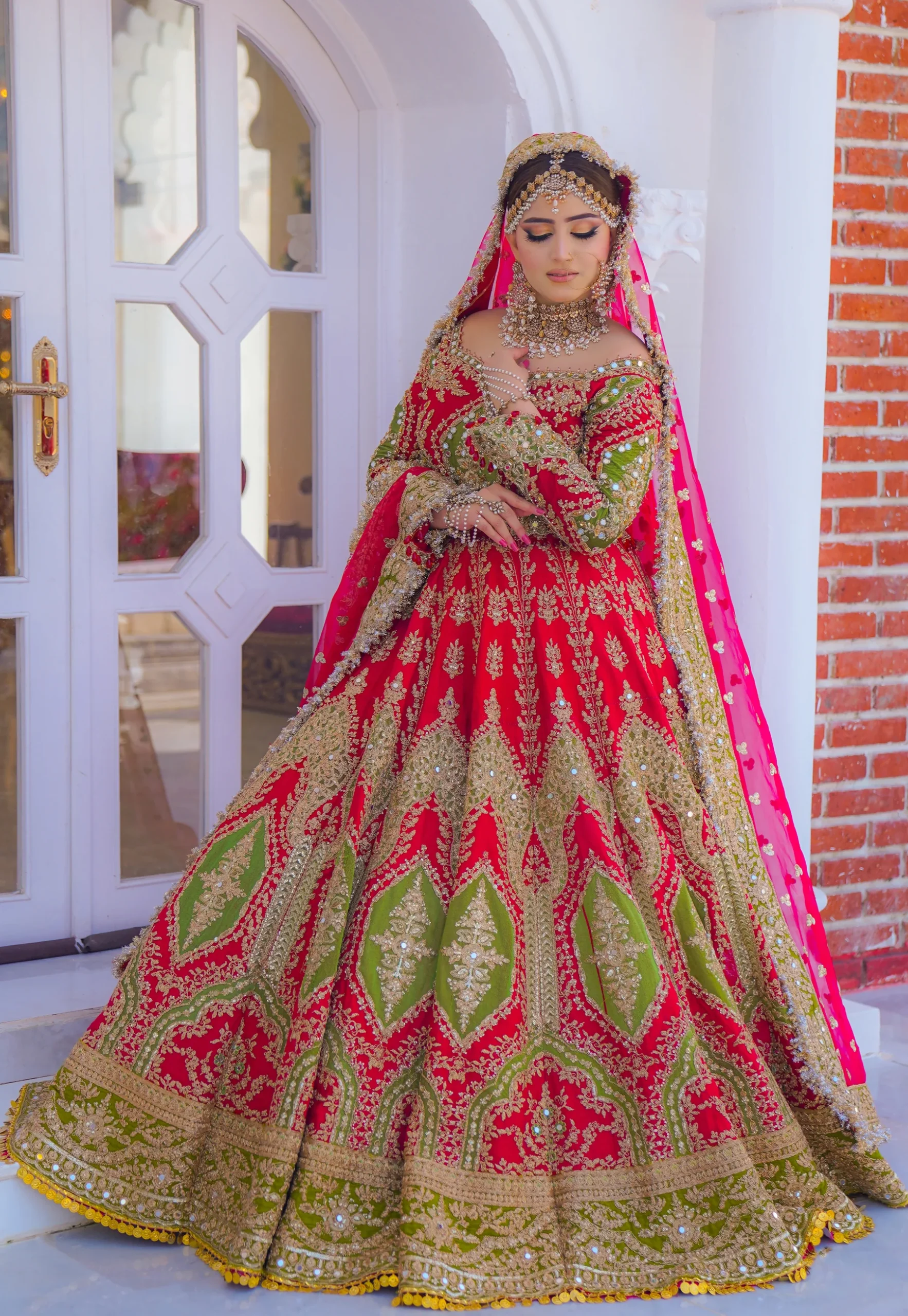 A regal bridal lehenga in pink, mehndi green, and silver hues, exquisitely hand-embellished with intricate embroidery and shimmering accents, finished with a majestic dupatta for timeless elegance.