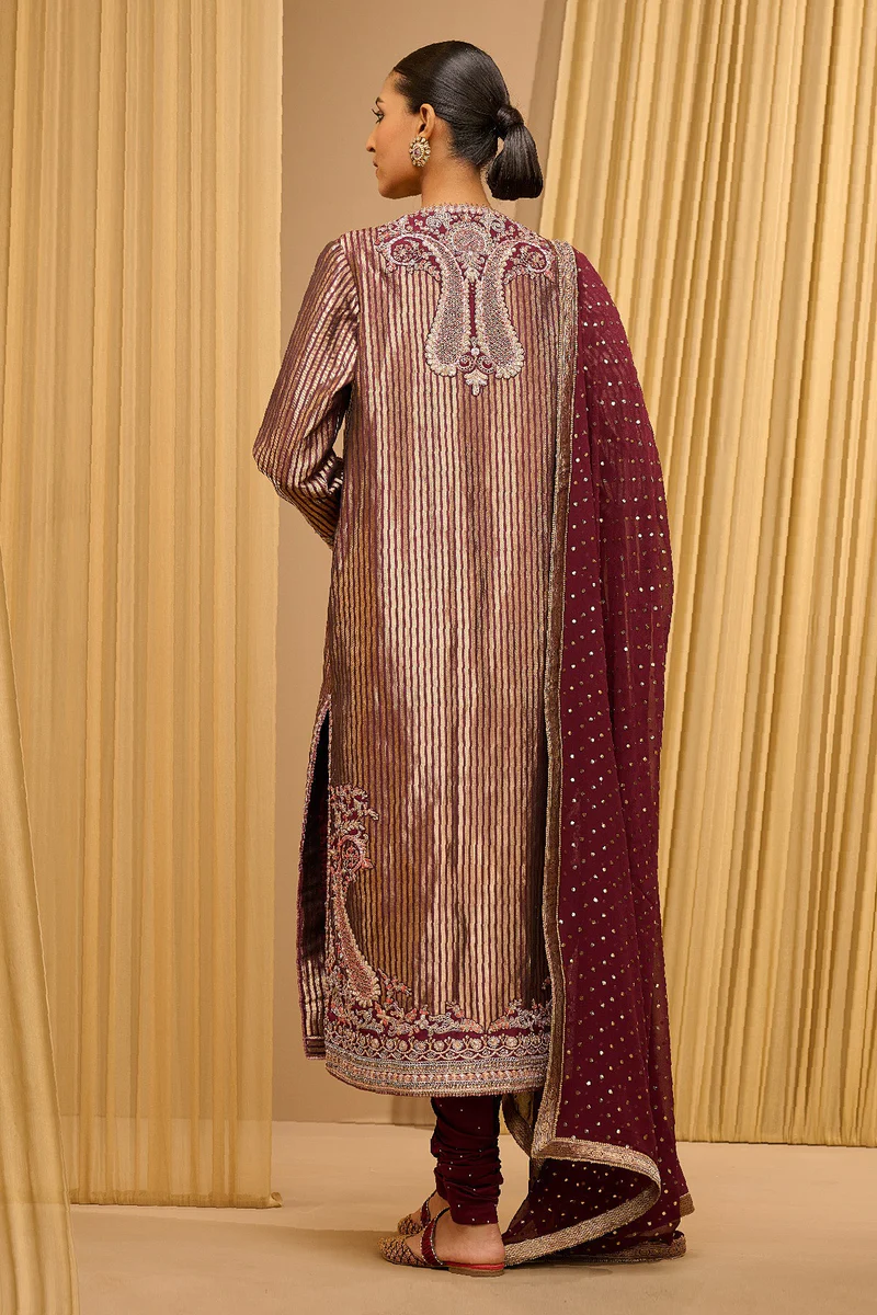 The top is designed as an elongated straight-cut kurta silhouette. Its split neckline and front placket are highlighted with ornate golden and silver embroidery that creates a striking contrast against the deep plum base. The fabric features a shimmering pinstripe texture throughout the surface, while the side slits and hem carry dense, handcrafted decorative motifs for added refinement. The sleeves are finished with matching embroidered cuffs, enhancing the opulent character of the ensemble.
