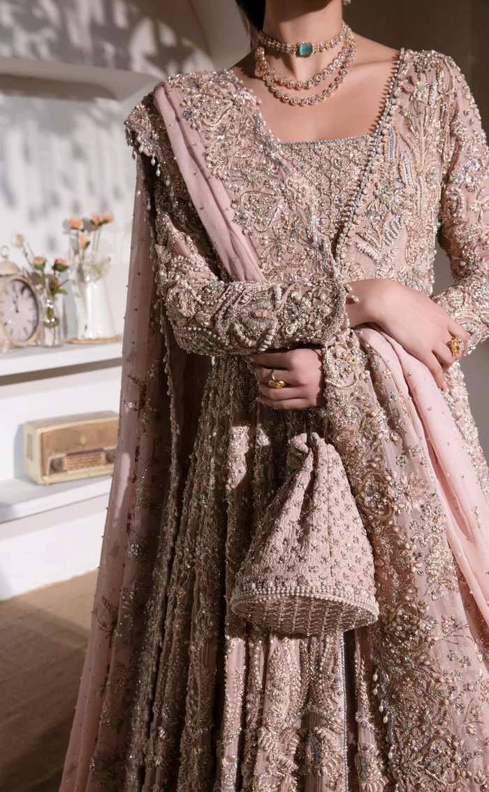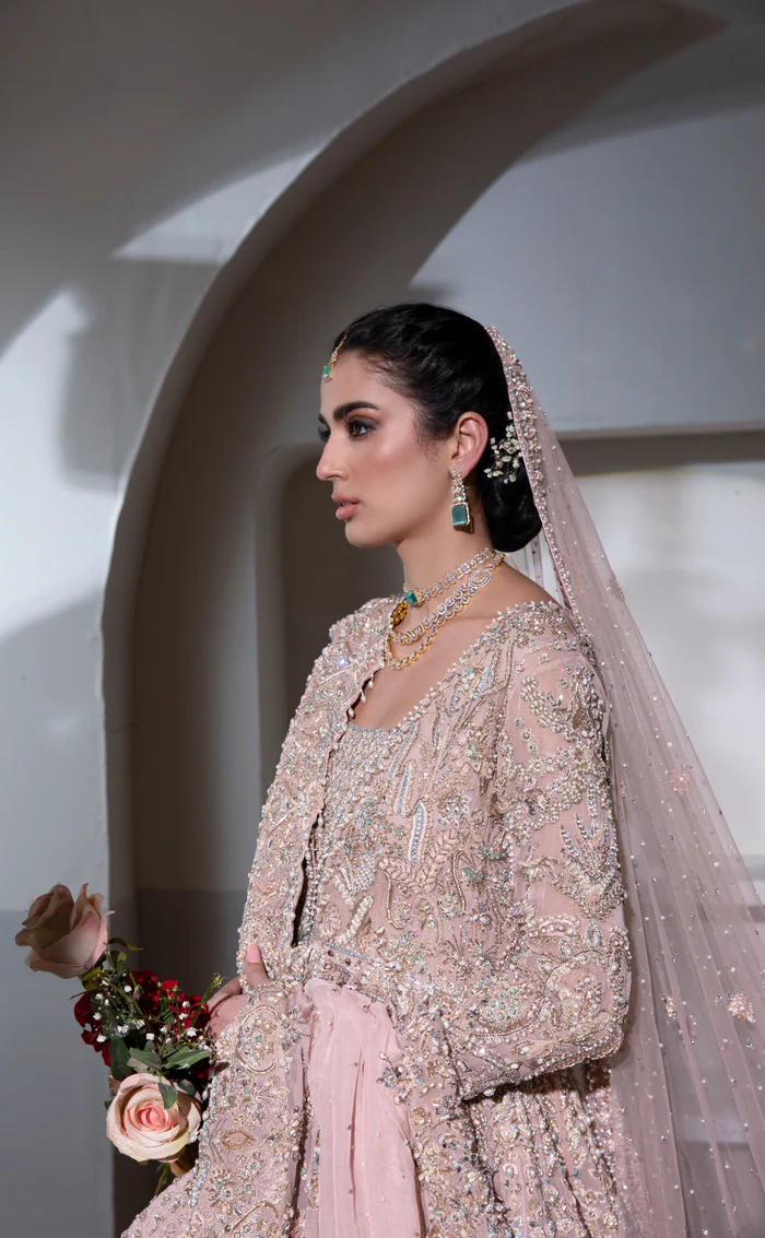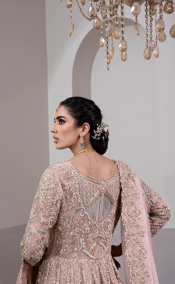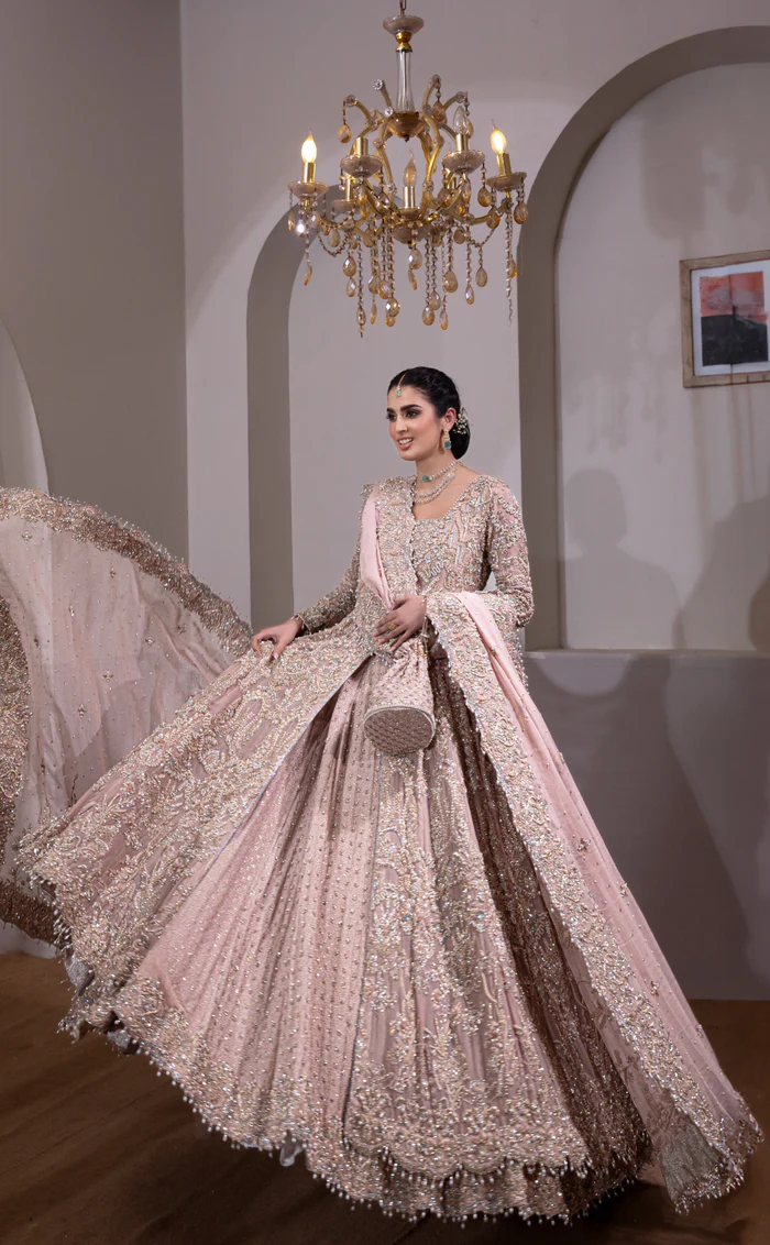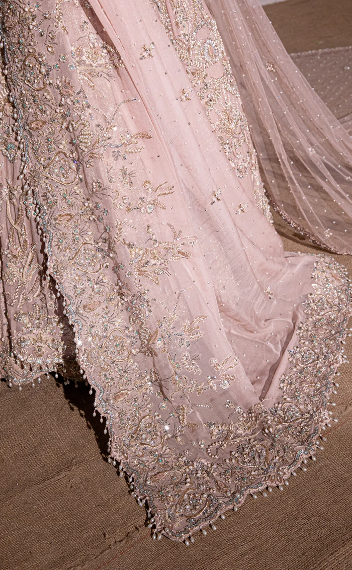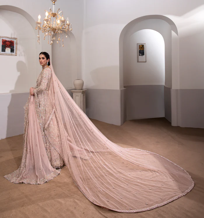 The ensemble is completed with a dupatta crafted from net and chiffon, harmonizing with the powder pink tones of the gown. The dupatta features subtle embellishments and a delicate border, enhancing the overall regal aesthetic while allowing for graceful draping.
