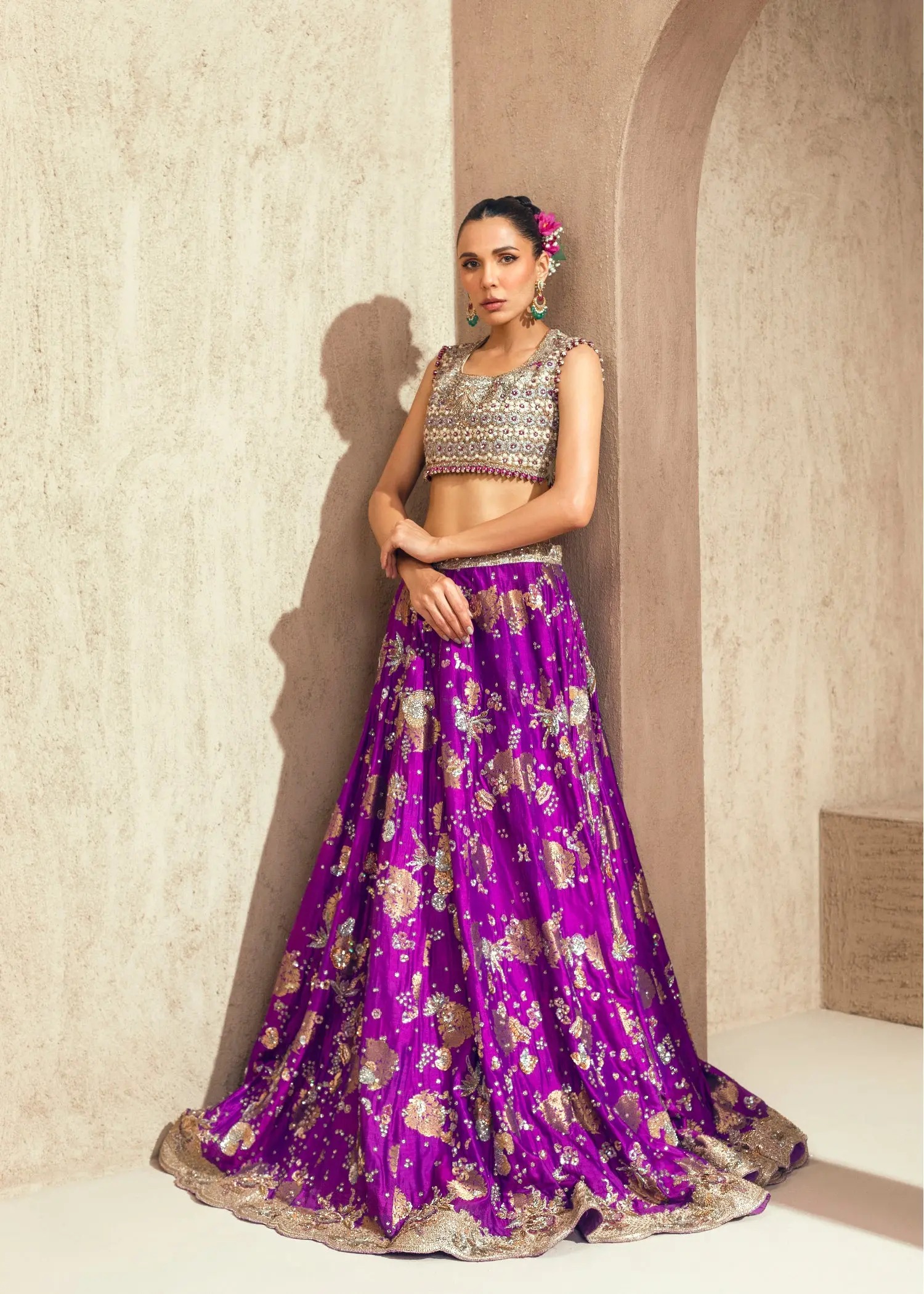 The lehenga is rendered in a rich amethyst purple silk-blend fabric, crafted with an expansive, voluminous flare from the waist downward. The panels are richly decorated with intricate hand-placed gold and silver floral appliqué motifs, and a shimmering spray of sequins covers the remaining fabric for an elegant, luminous effect. The hem is finished with a heavy, scalloped golden border that adds a regal touch and enhances the movement of the skirt. The piece is fully lined and equipped with a discreet side zip for a smooth fit.