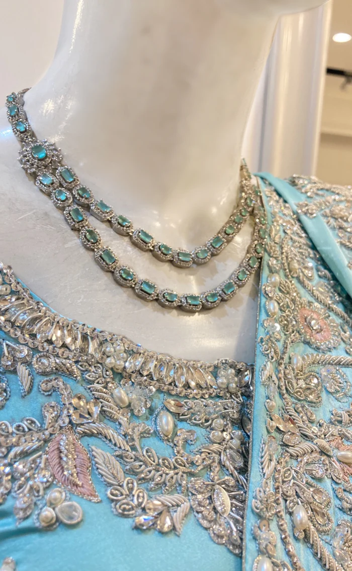 In this traditional silhouette, the pallu functions as the dupatta, featuring a dramatic display of artisanal work. The edges are finished with a scalloped-style embroidery pattern, and the corner of the pallu is weighted with dense crystal and pearl drops to ensure a graceful fall over the arm or shoulder.