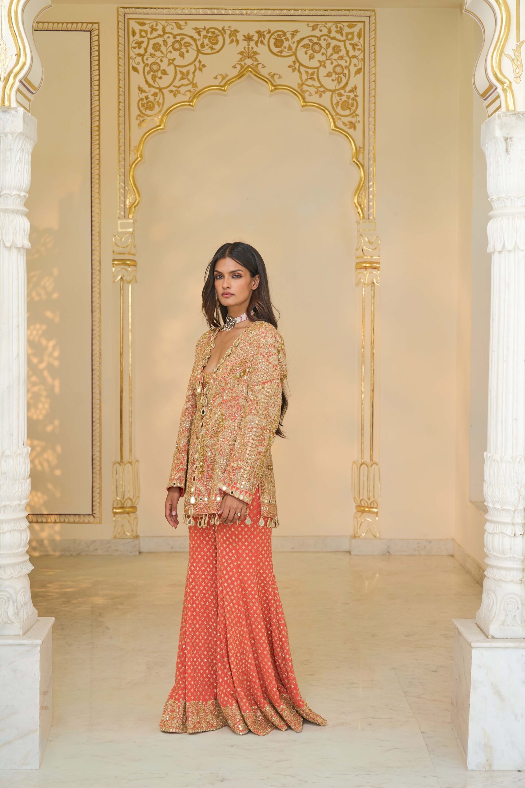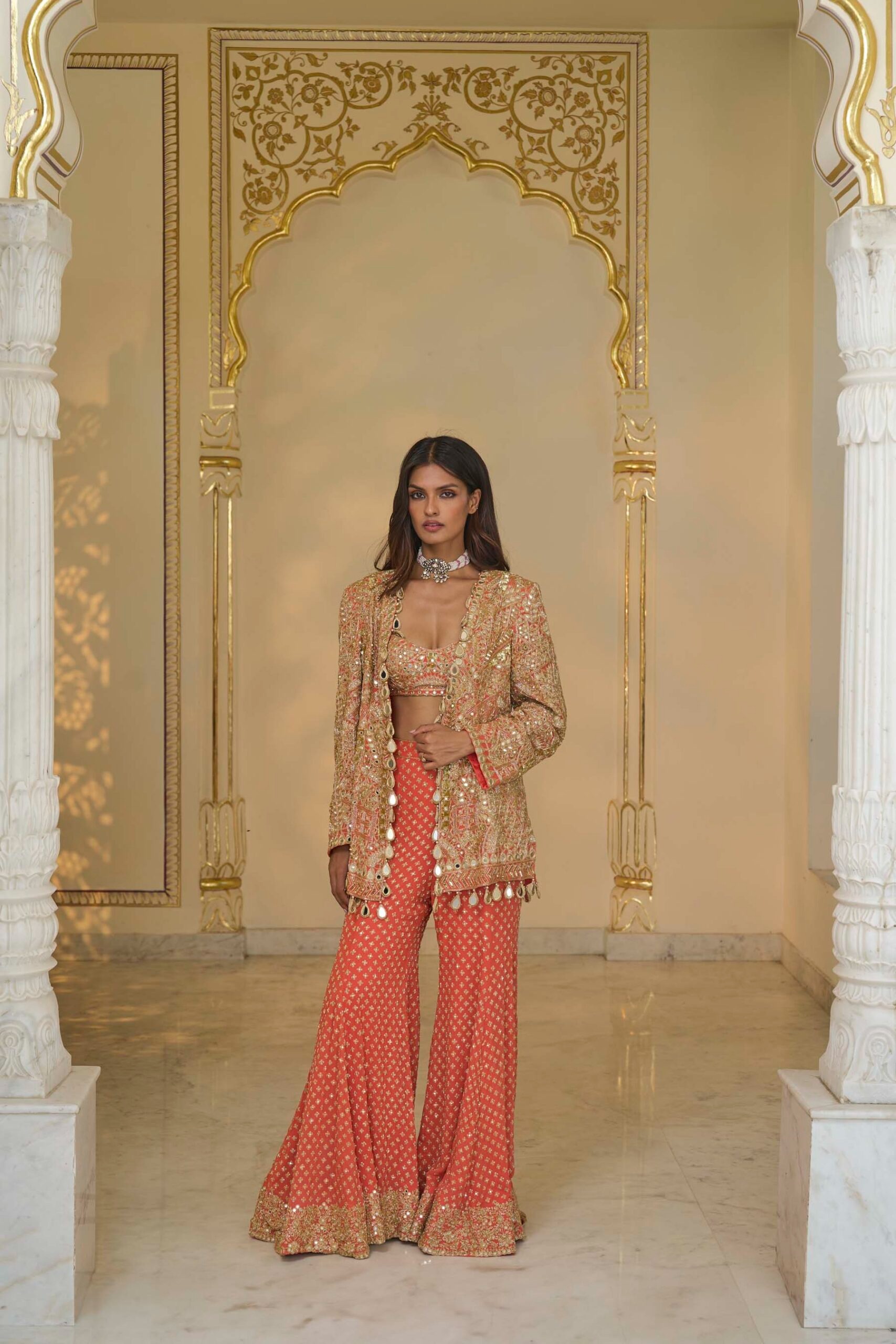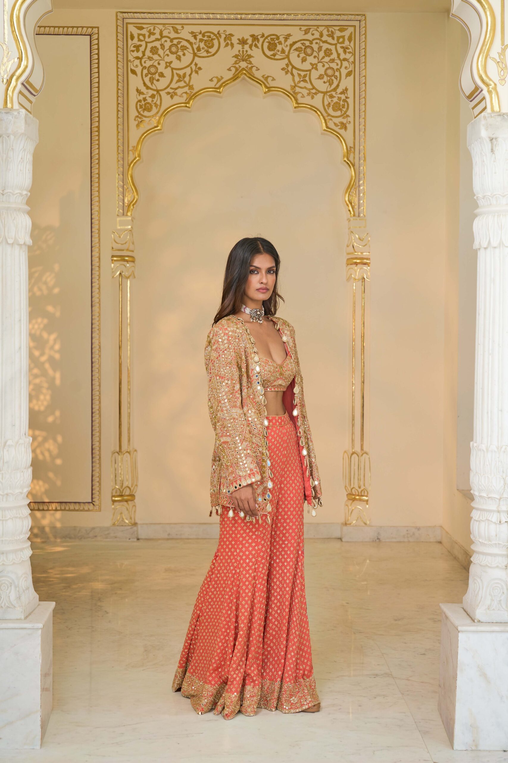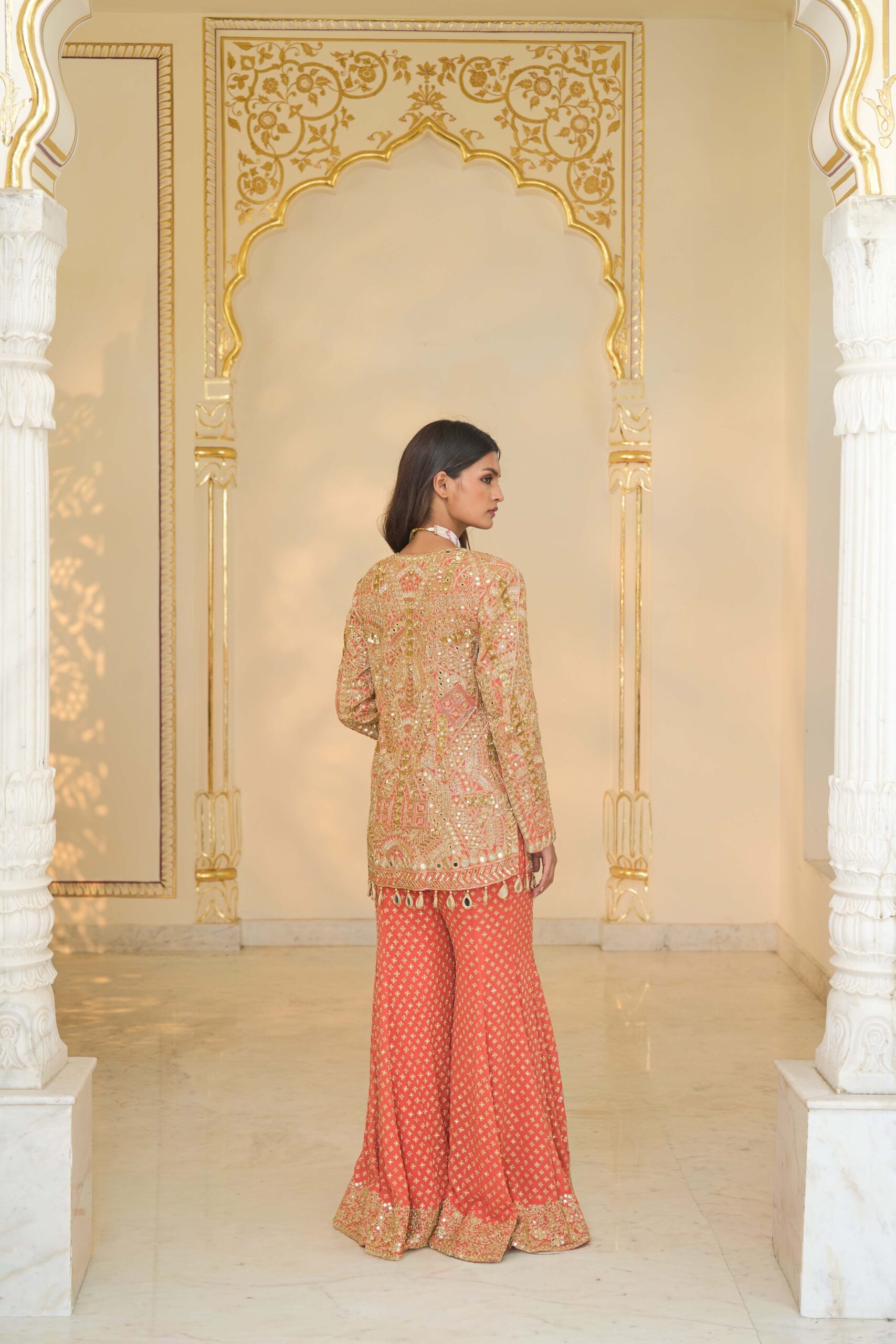 A warm coral and light gold hand-embroidered jacket set featuring mirrorwork, cutdana details, and a beautifully crafted star-pattern sharara.
