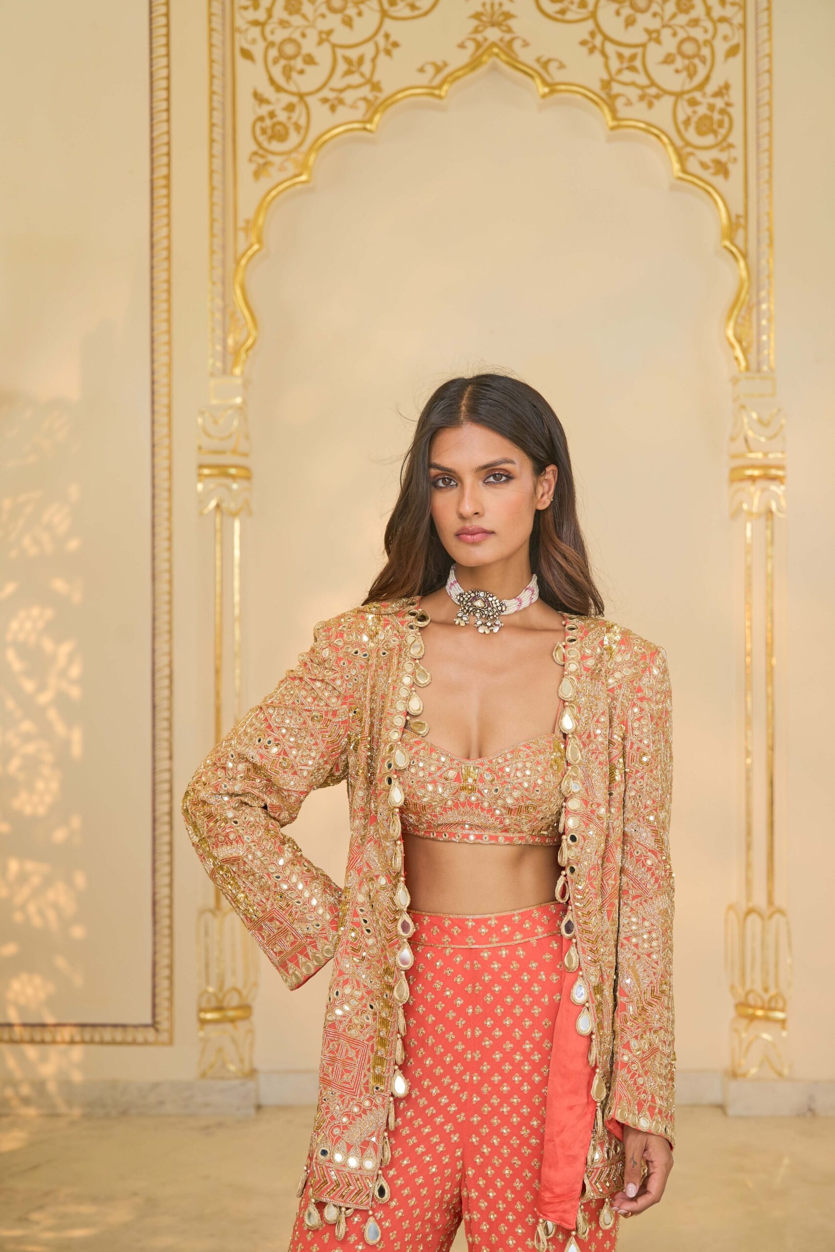 The jacket is tailored in a warm coral tone, designed with a sleek linear silhouette that offers both structure and graceful movement. The surface is embellished with intricate handwork, blending mirror accents and fine cutdana detailing that add refined sparkle. Its open-front styling pairs seamlessly with the inner blouse, creating a sophisticated contemporary look.
