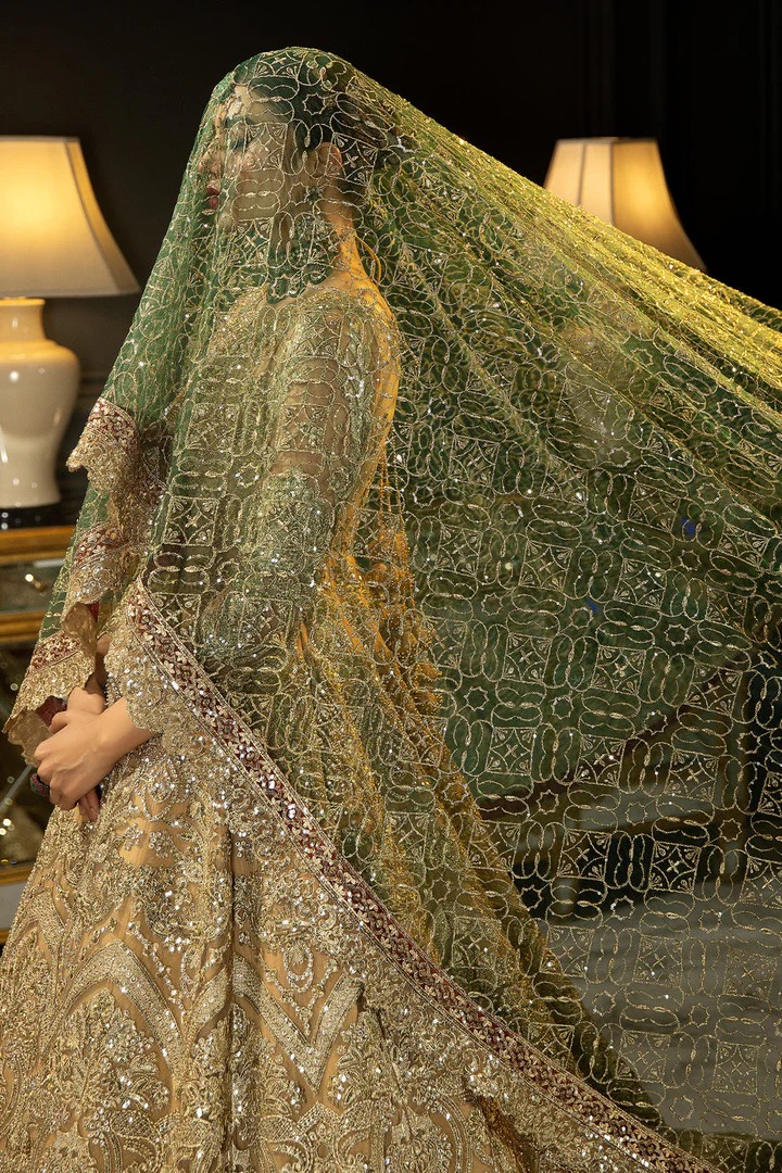 Underneath, a carefully paneled inner dress made from raw silk or an equally structured textile provides form, comfort, and a smooth foundation for the outer tulle. This layer ensures the pishwas maintains its shape and volume, while offering support for the intricate surface work. The combination of a delicate outer and a supportive inner gives the ensemble a polished finish and a standout wedding-worthy presence.