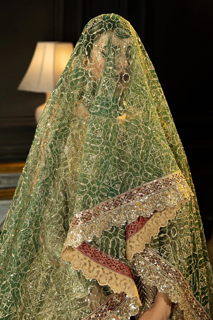 The look is completed with a delicate organza dupatta that harmonizes beautifully with the pishwas. Embroidered borders and floral accents add sophistication and balance. Its soft drape and subtle detailing create a graceful finishing touch to the ensemble.