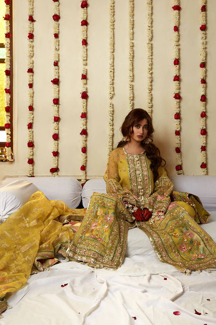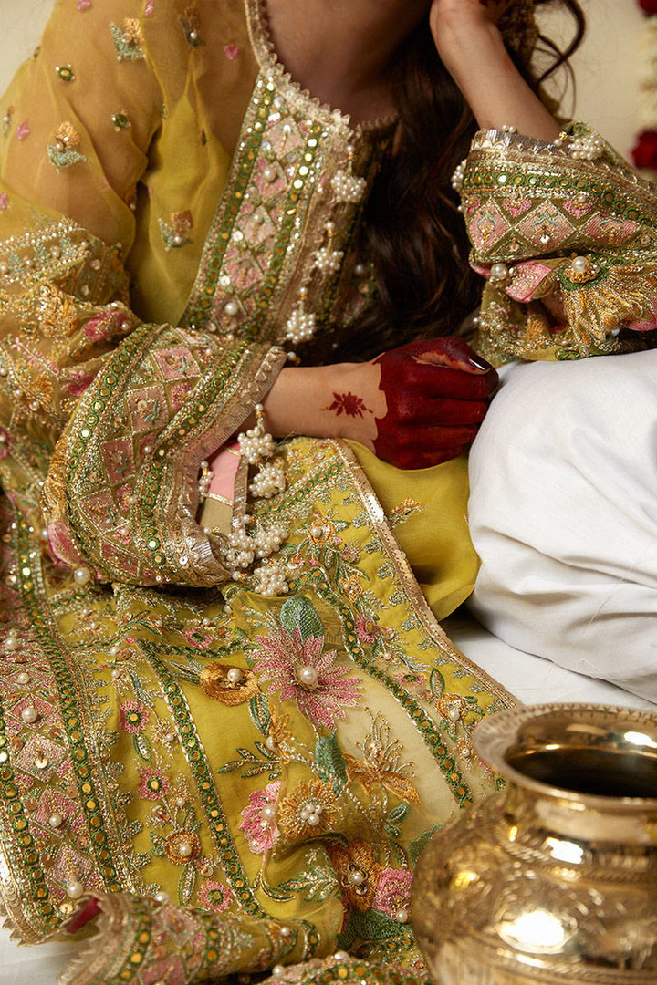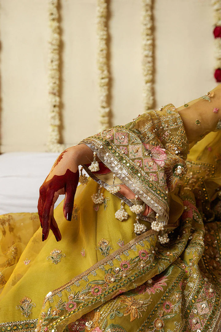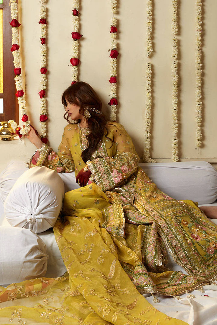 The lemon yellow kameez is beautifully crafted in organza and adorned with intricate tilla, Resham, and gota embroidery. Handcrafted details of sequins, pearls, and cut-dana enhance the glamour and elegance of this kameez, making it a perfect choice for bridal or festive occasions.
