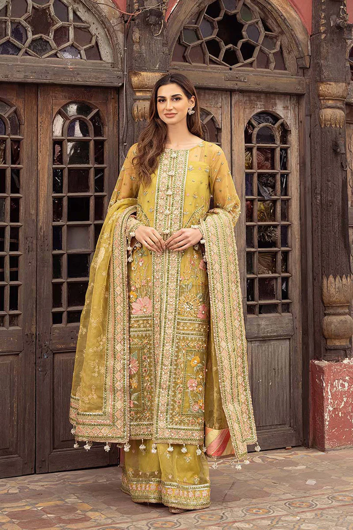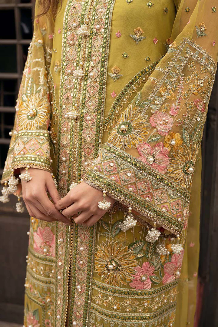 The outfit is completed with a lightweight green organza dupatta featuring embellished borders. The lavish contrast of colors adds sophistication and a chic finish to this Pakistani wedding ensemble.