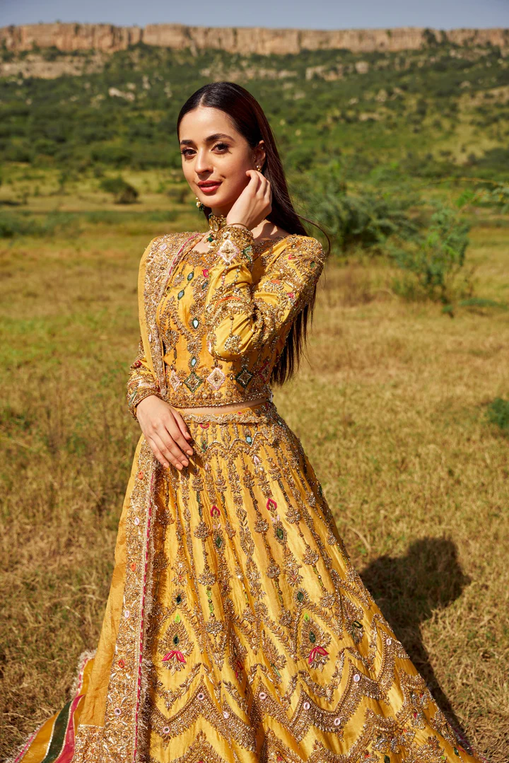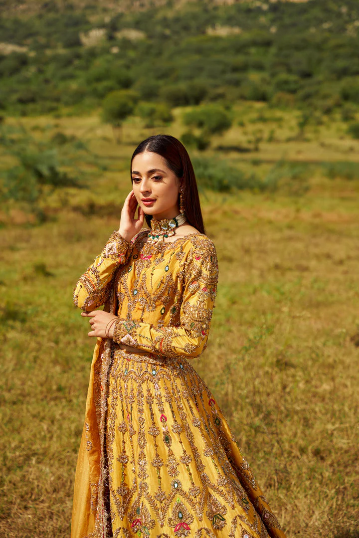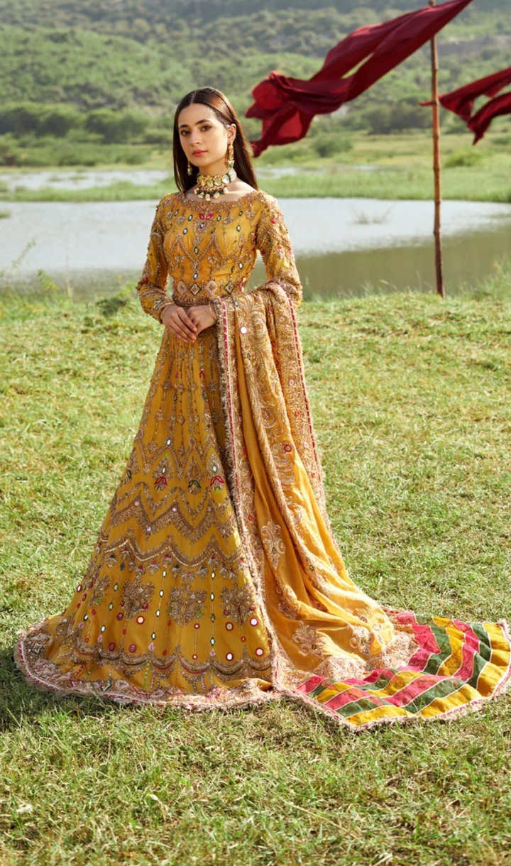 Heavy Gold Tilla, Dabka, Sequins, Stones, Crystals, Resham (thread) Embroidery, and prominent Mirror Work creating a vibrant, traditional Pakistani bridal aesthetic suitable for Mehndi or Wedding events.