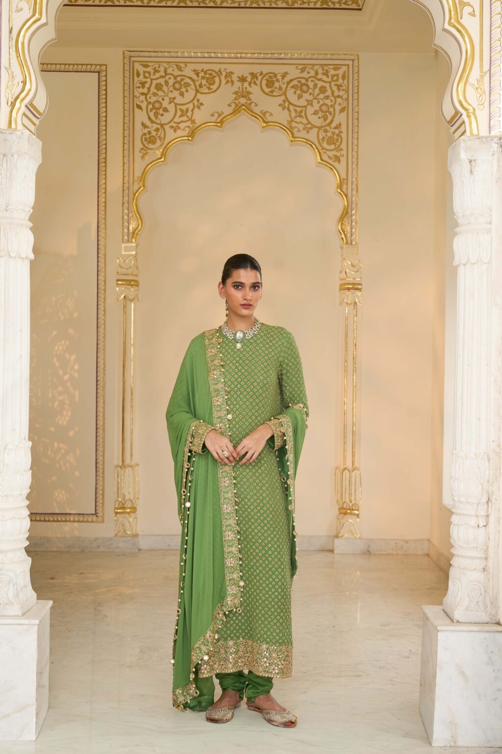 A warm olive and beige gold kurta set adorned with delicate handcrafted detailing, paired with a complementing dupatta for an elegant and timeless festive look.