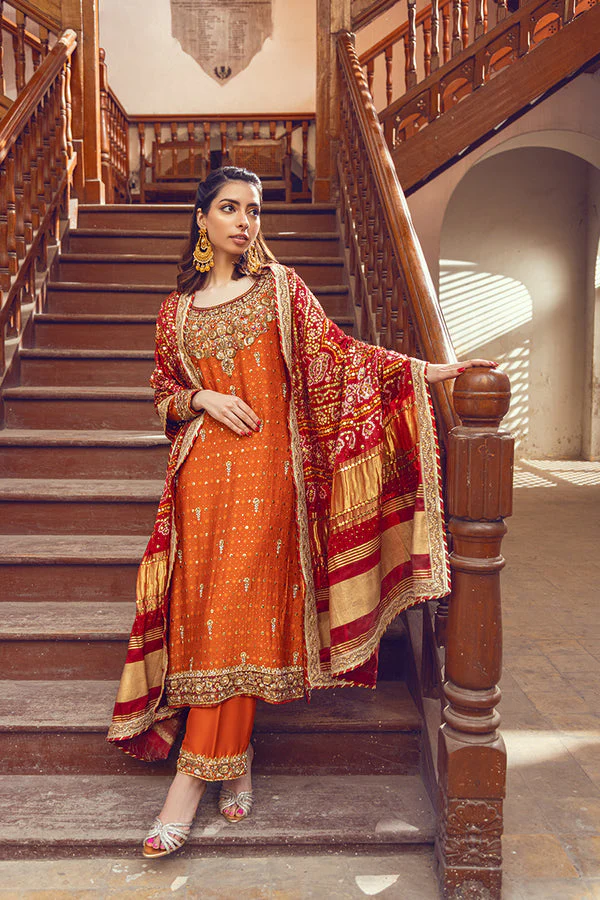 A mesmerizing Orange Kameez and Salwar set paired with an exquisite Red Dupatta, featuring intricate hand-embellishments for a regal Mehndi look.