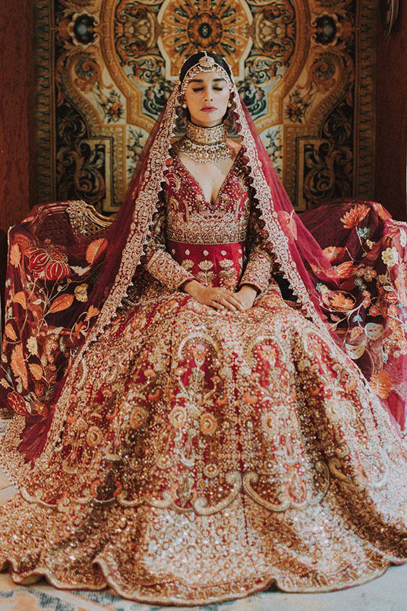 This luxurious red raw silk bridal set dazzles with exquisite sitara, dabka, gota, and Swarovski detailing. Paired with an intricately adorned aari dupatta and a perfectly coordinated choli, it creates a strikingly regal look ideal for any grand celebration.