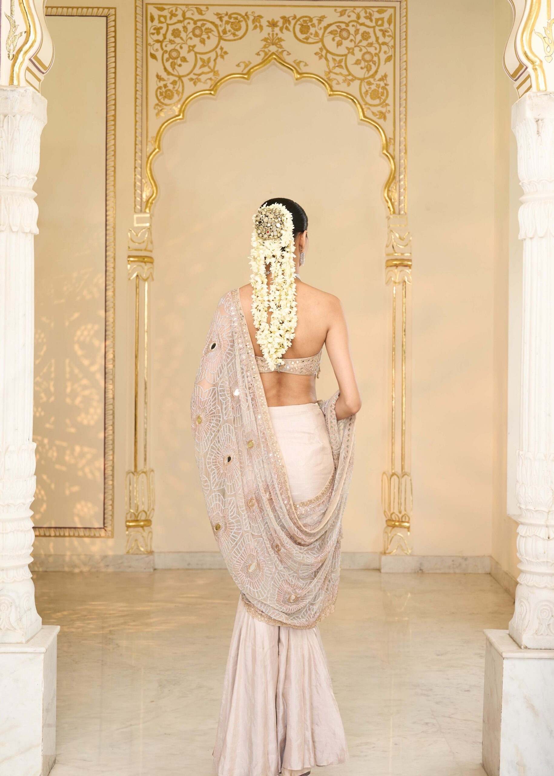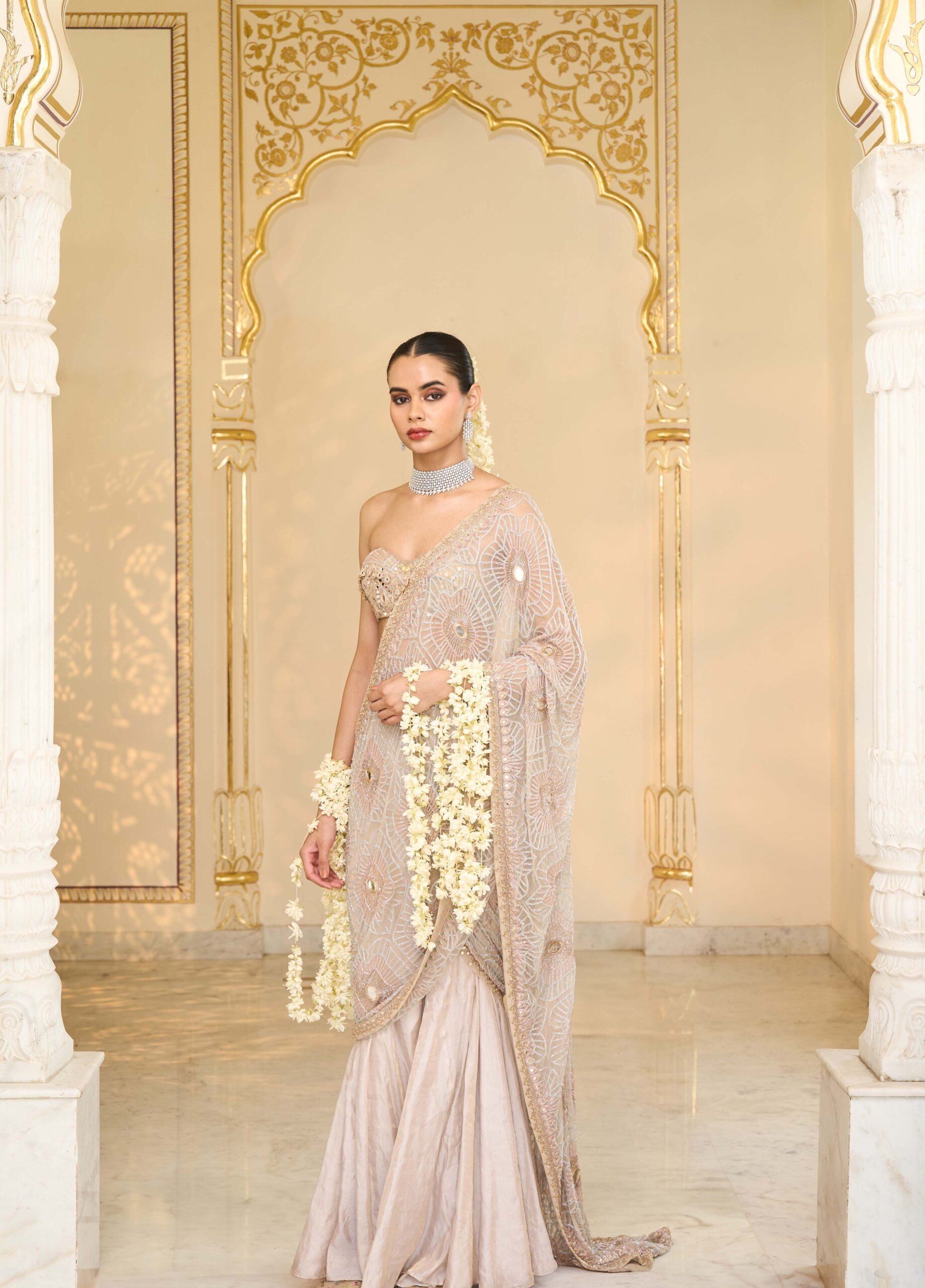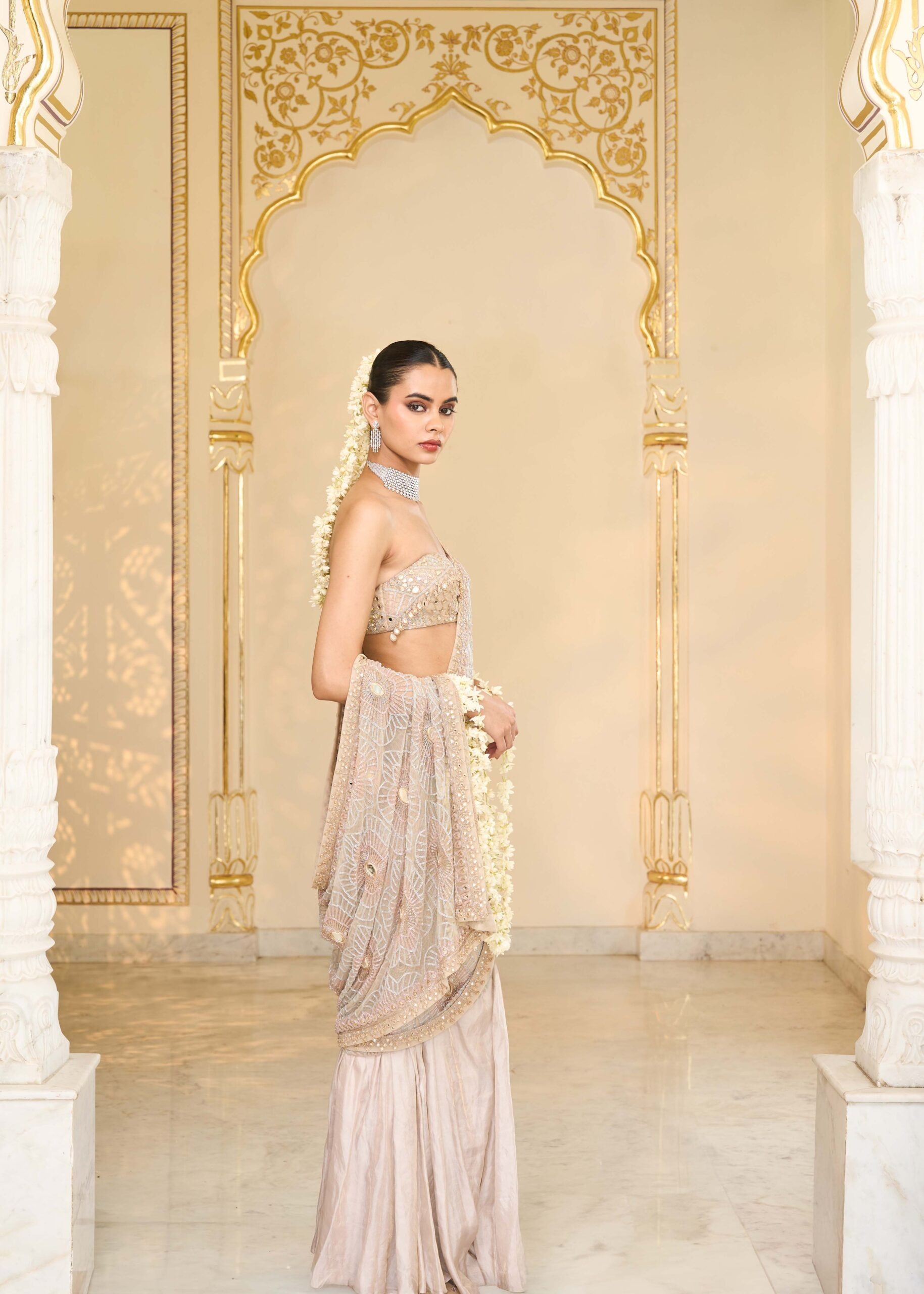 The saree is crafted from luxurious tissue fabric known for its luminous texture and graceful fall. Designed with godet panels, it adds subtle flare and flow to the silhouette. The material’s soft shimmer enhances movement, giving the saree an elegant and elevated presence perfect for weddings and receptions.