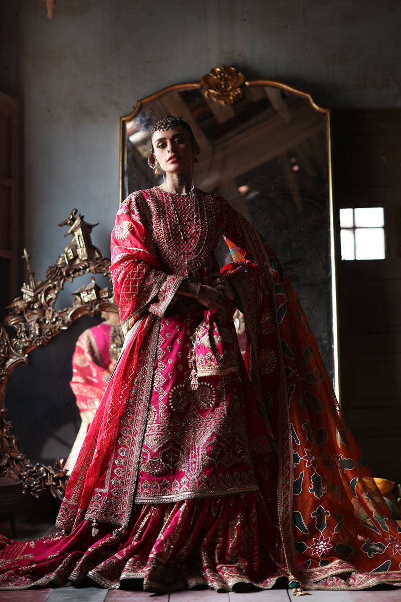 A vibrant rani pink palette enhanced with tonal embroidery, offering a bold yet elegant bridal statement.