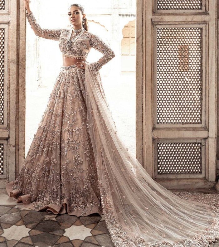 The bridal choli is designed with a deep neck silhouette, crafted from delicate net fabric in a soft Rani pink shade. Intricate hand-applied crystals, pearls, sitara, semi-precious stones, and resham embroidery adorn the choli, creating a radiant and luxurious look. Each embellishment reflects meticulous craftsmanship, making the choli a statement piece for brides seeking elegance and sophistication.