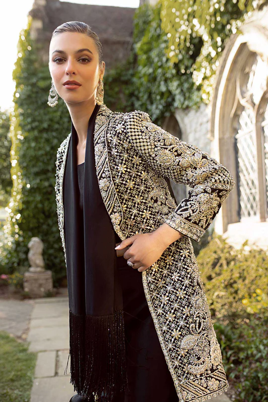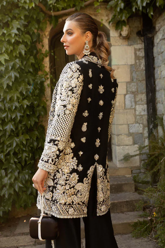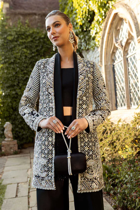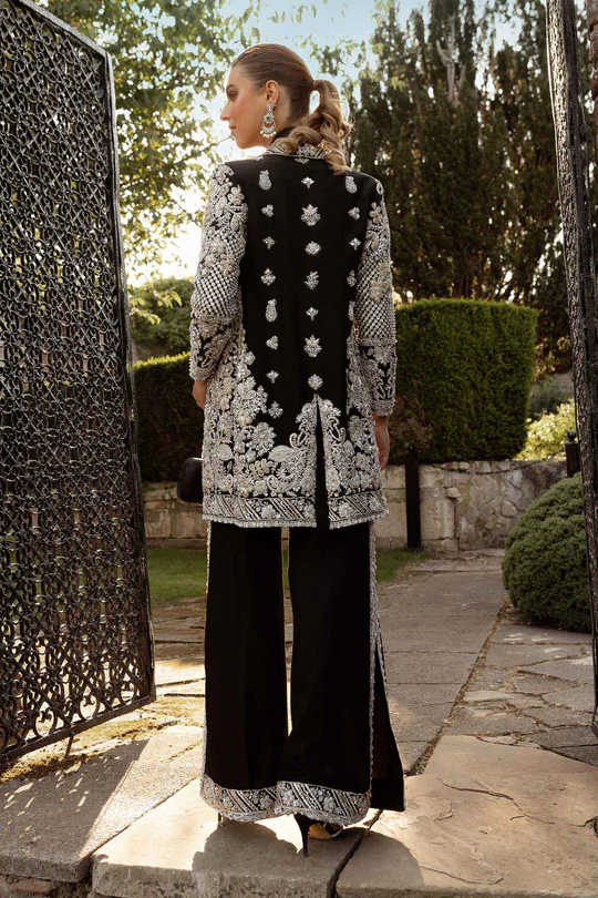 The top is crafted as an elongated coat silhouette in deep black fabric, tailored for a clean and structured fall. The front opening, neckline, borders, and hem are richly adorned with intricate silver embroidery and embellishment, creating a sharp contrast against the dark base. Delicate beadwork and sequins are scattered throughout, while dense geometric detailing at the hem and cuffs adds visual depth. The long sleeves are fully embellished, enhancing the luxurious and statement-making appeal. A smooth inner lining ensures comfort and a polished finish.