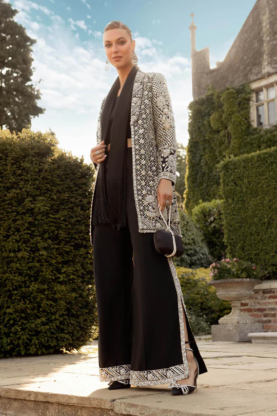 Fully encrusted black raw silk jacket with crystals, pearls, and naqshi work paired with structured bustier, tailored trousers, and silk scarf.