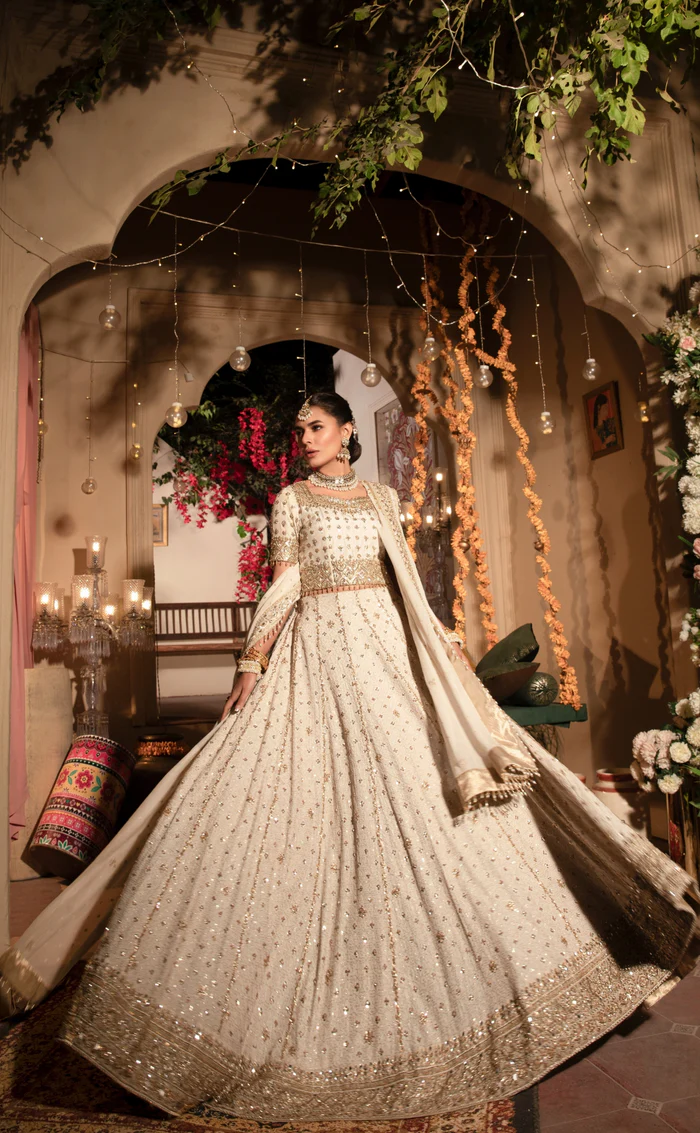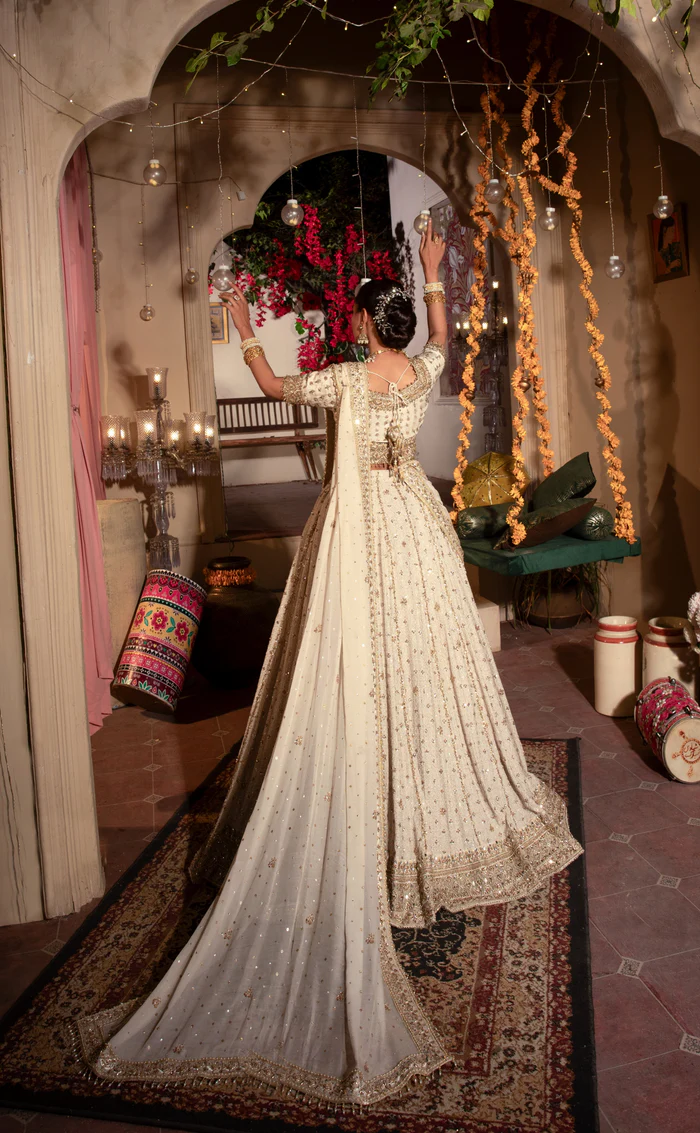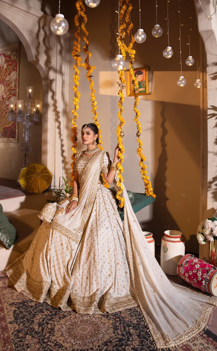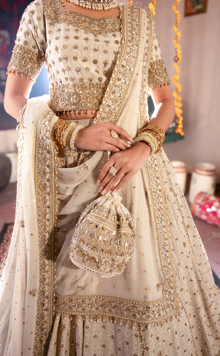 The choli is crafted from luxurious raw silk and showcases masterful hand embroidery that reflects true artisanal excellence. Golden zari, zardozi, cora, dabka, tilla, sequins, beads, and crystals are intricately worked together to create a rich, luminous surface. Delicate tassel details add a graceful finishing touch, elevating the choli into a statement of regal sophistication perfect for a Nikkah ceremony.