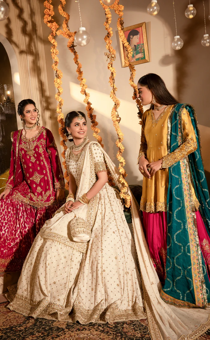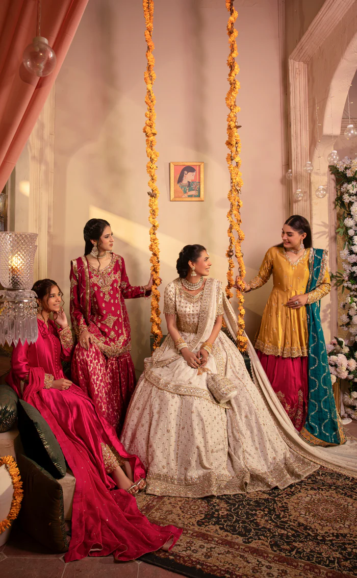 A regal raw silk lehenga set adorned with exquisite hand embroidery, designed for the Nikkah bride who desires timeless elegance and refined craftsmanship.