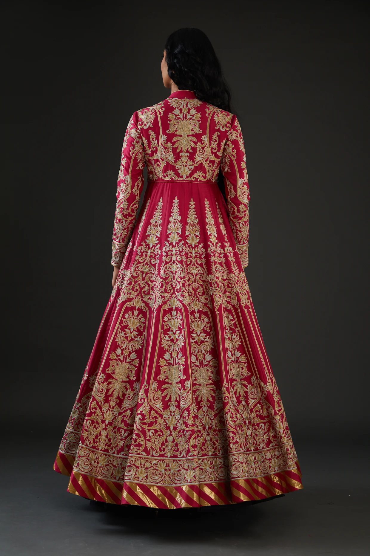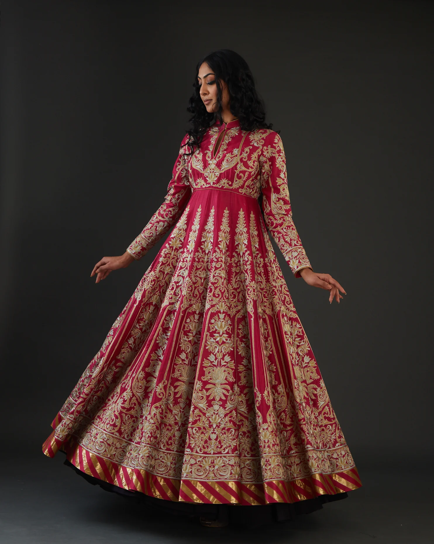 The Anarkali kurta is tailored from luxurious Chanderi fabric in a striking red shade. Its silhouette flows gracefully, enhanced by soft flare and a comfortable inner finish. Detailed resham embroidery decorates the surface, adding refined texture and richness. The construction offers a balanced blend of structure and elegance, making it suitable for festive and formal occasions.