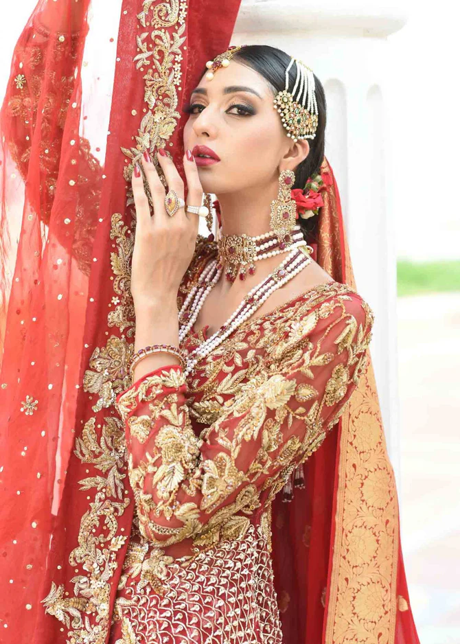 The ensemble is completed with a luxurious red dupatta featuring hand-applied zardosi, sitara, sequins, and pearl work. The heavily embellished borders create a flawless finishing touch, adding elegance and sophistication to the bridal attire.