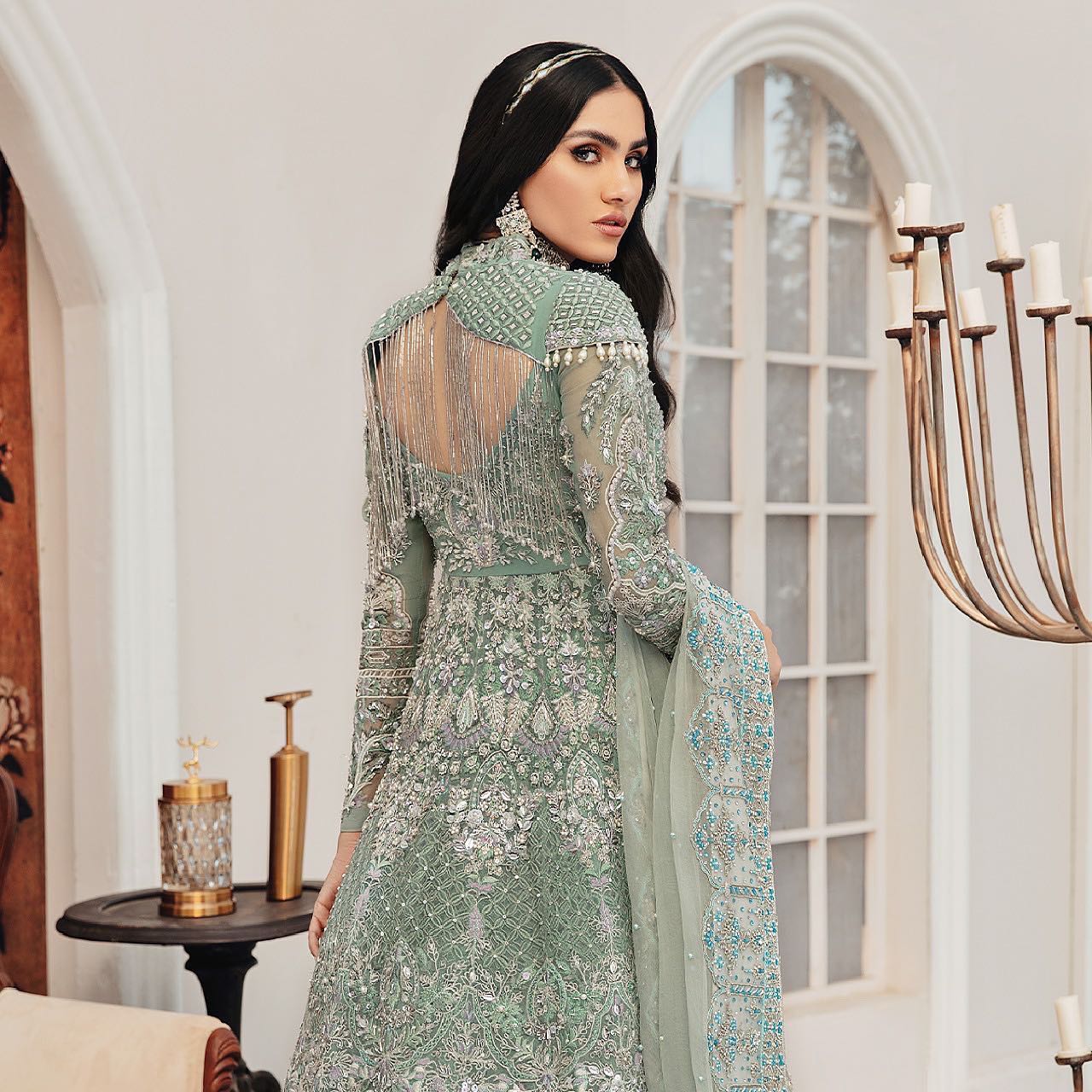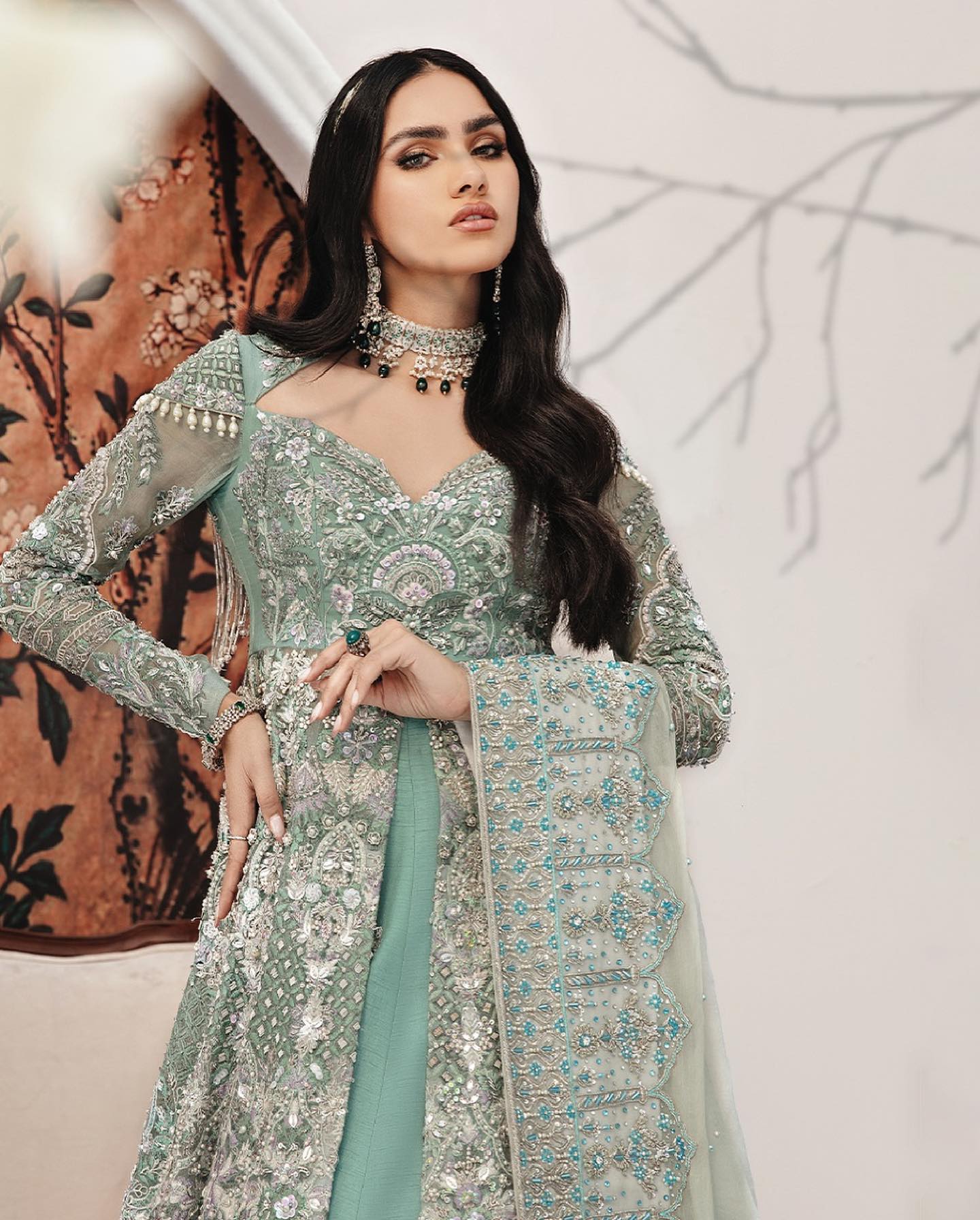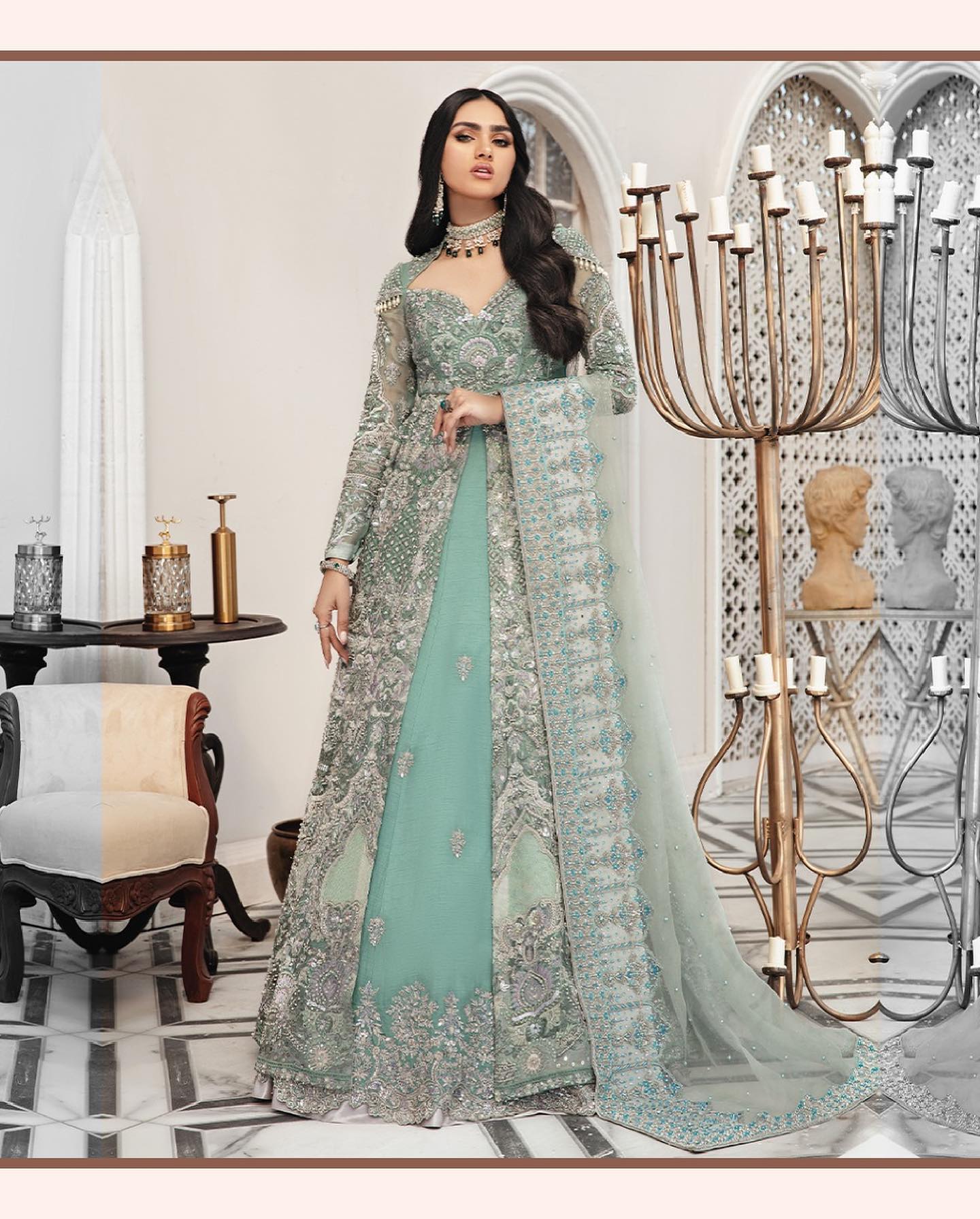 Completing the ensemble is a delicate premium organza dupatta, meticulously embellished with blue and white beads, stones, and handcrafted motifs. The beautifully adorned borders complement the gown and Lehenga, adding a final touch of elegance and refinement. Softly draped, this dupatta enhances the overall regal look of the front open gown Lehenga ensemble.