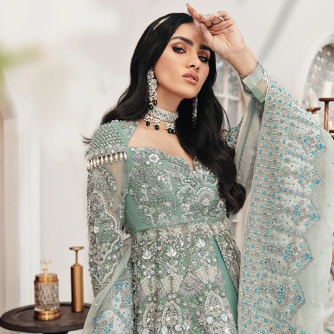 Make your wedding day unforgettable with this majestic blue front open gown Lehenga. Featuring intricate silverwork, floral motifs, and delicate embellishments, this ensemble radiates elegance and sophistication, perfect for the modern Pakistani bride.