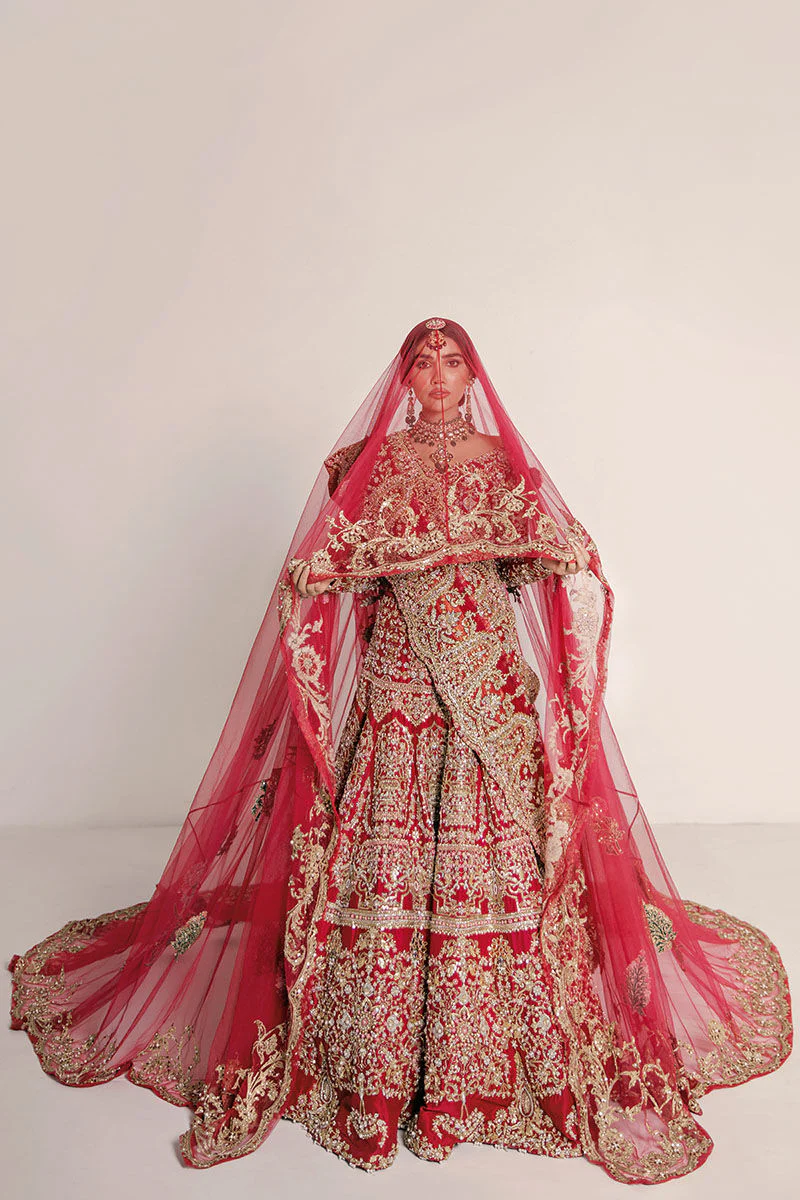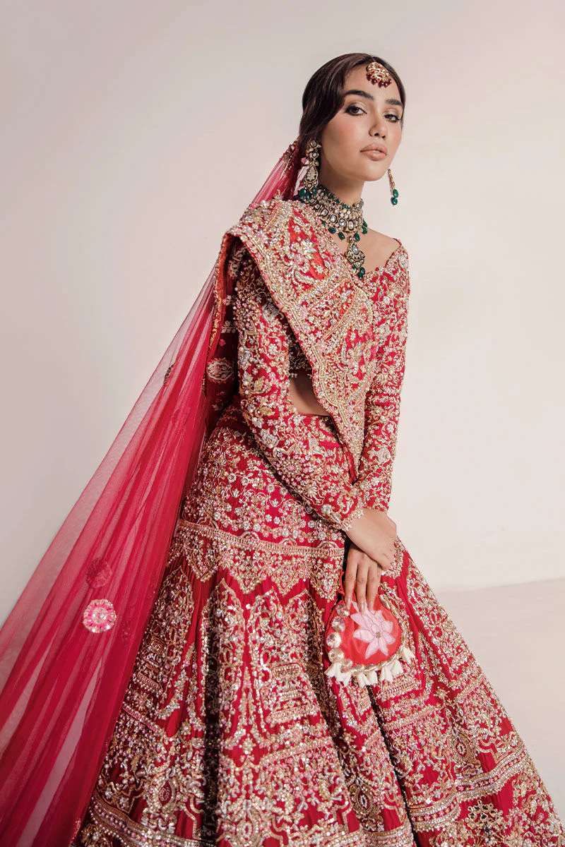 The cherry red raw silk choli is meticulously designed with traditional dabka, kora, and sequin motifs, complemented by pearl embellishments along the sleeves and borders. The intricate handwork creates a regal and sophisticated appeal, perfect for a Pakistani bridal ensemble.