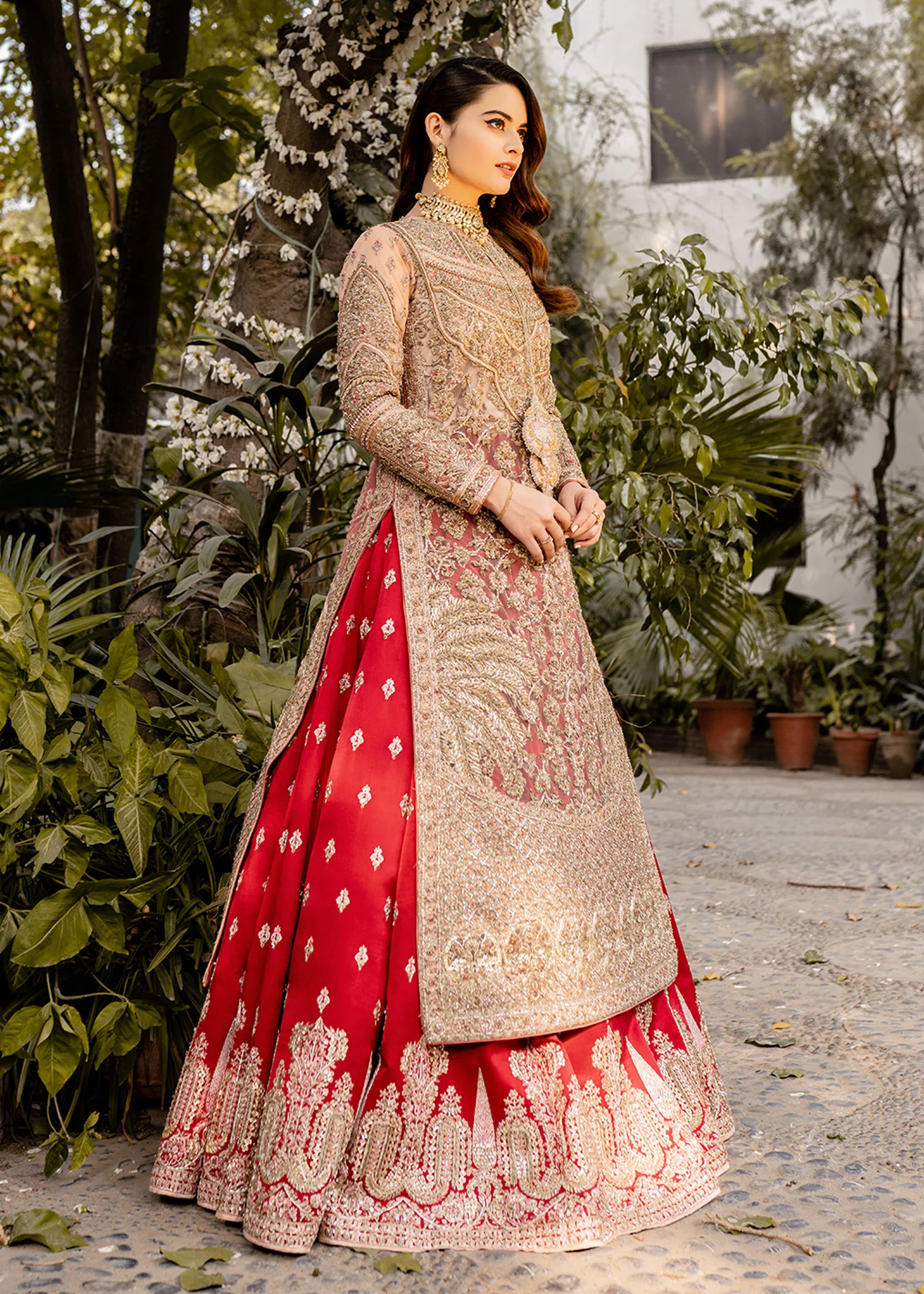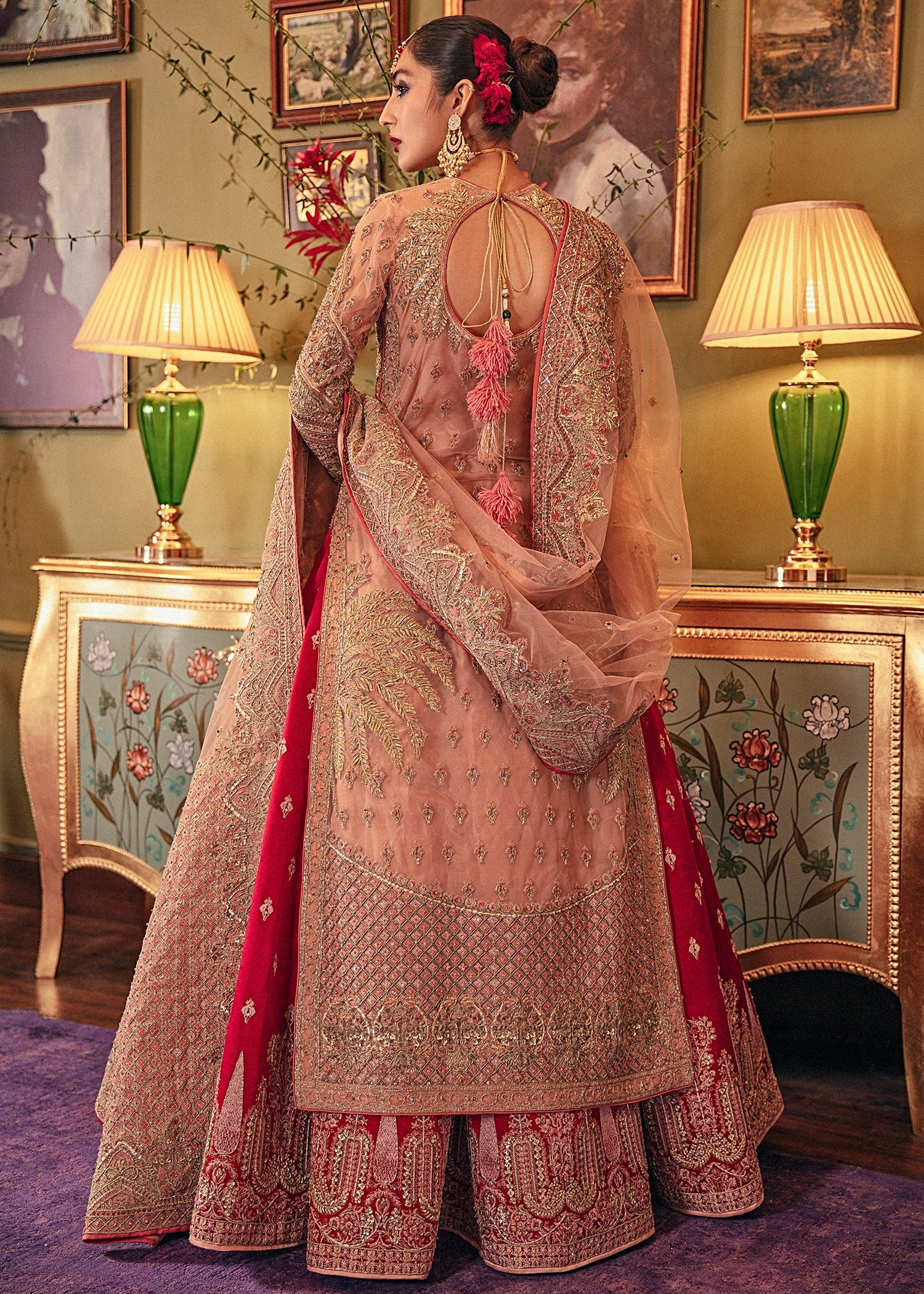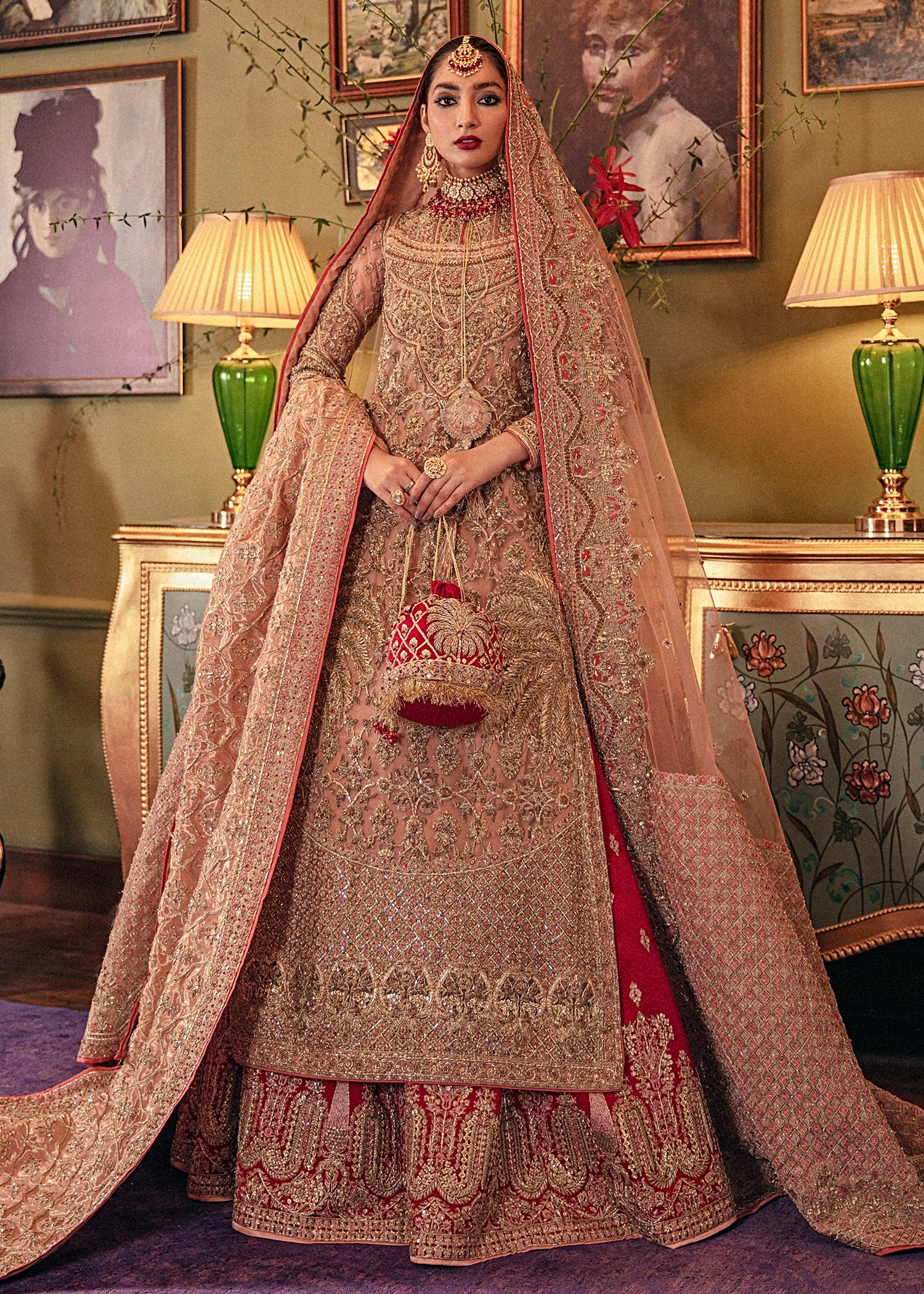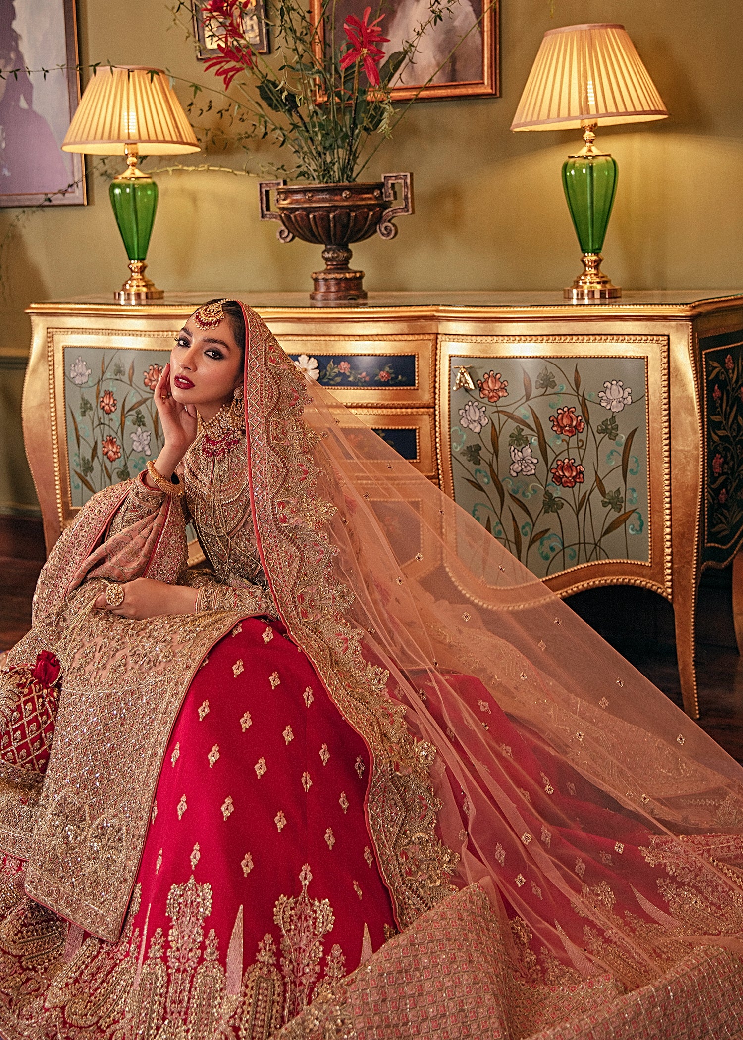 A luxurious bridal lehenga crafted from premium fabrics and adorned with intricate handwork, designed to create a stunning and elegant wedding-day look.