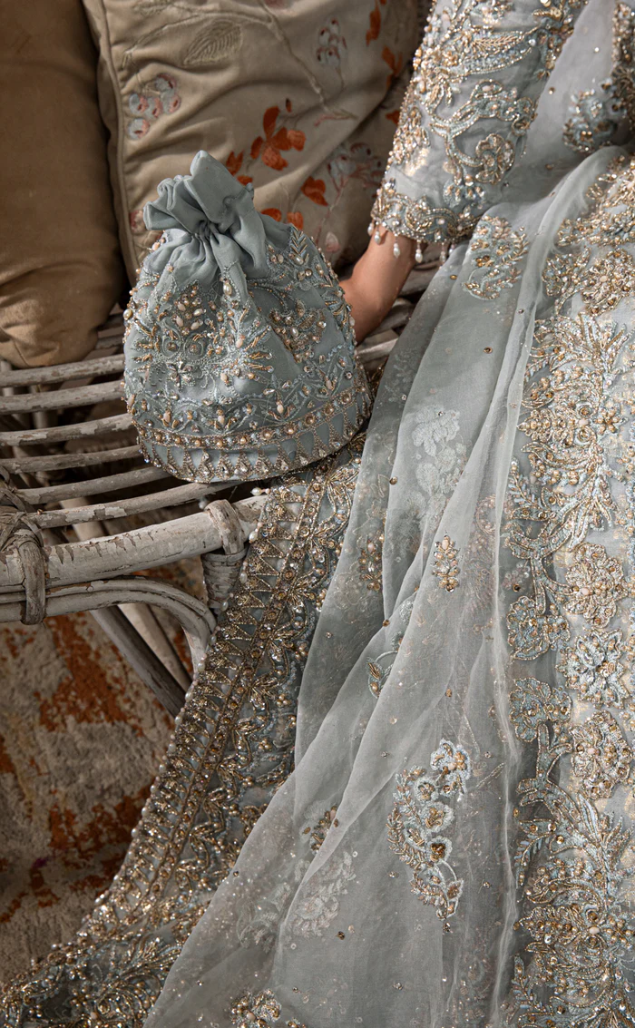 A mesmerizing ice blue maxi gown crafted from pure organza, featuring delicate hand embellishments and a matching dupatta, paired with a luxurious raw silk underdress for a flawless, elegant silhouette.