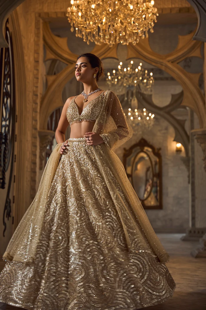 Premium net for the Peshwas, lehenga, and dupatta, with high-grade silk and satin lining for interior comfort and structural support.